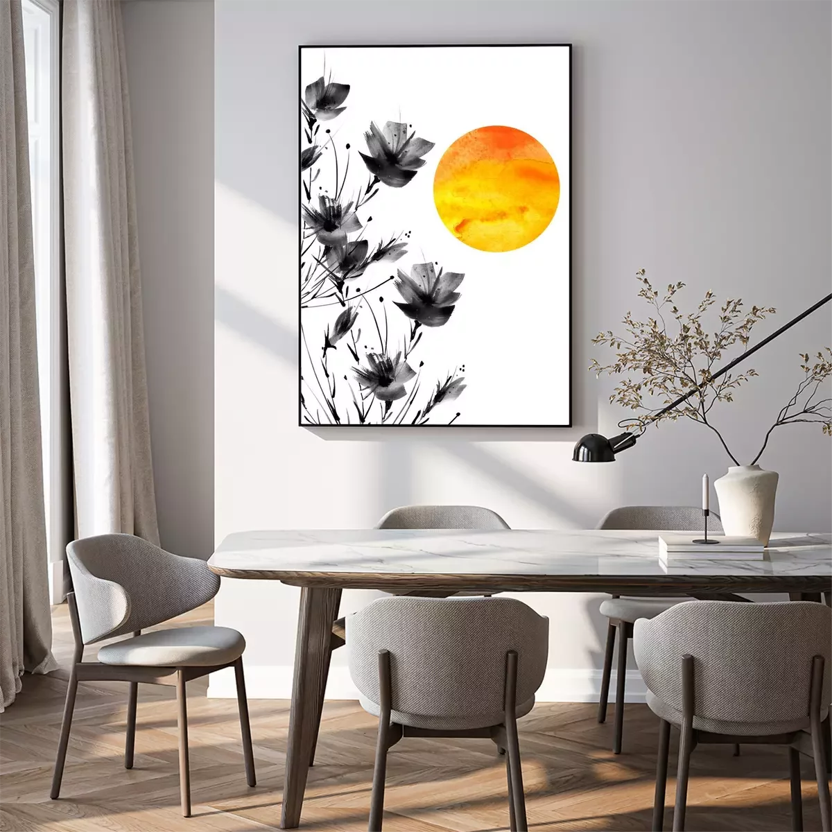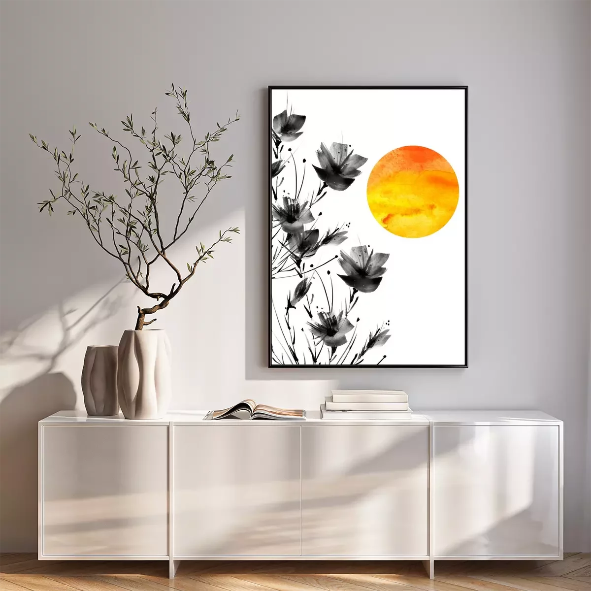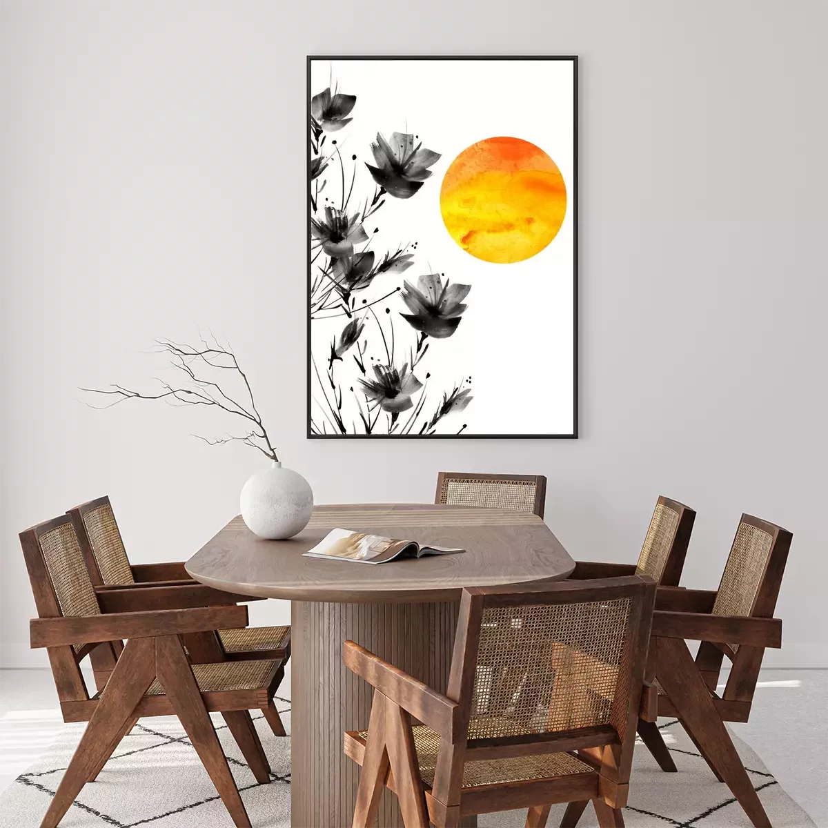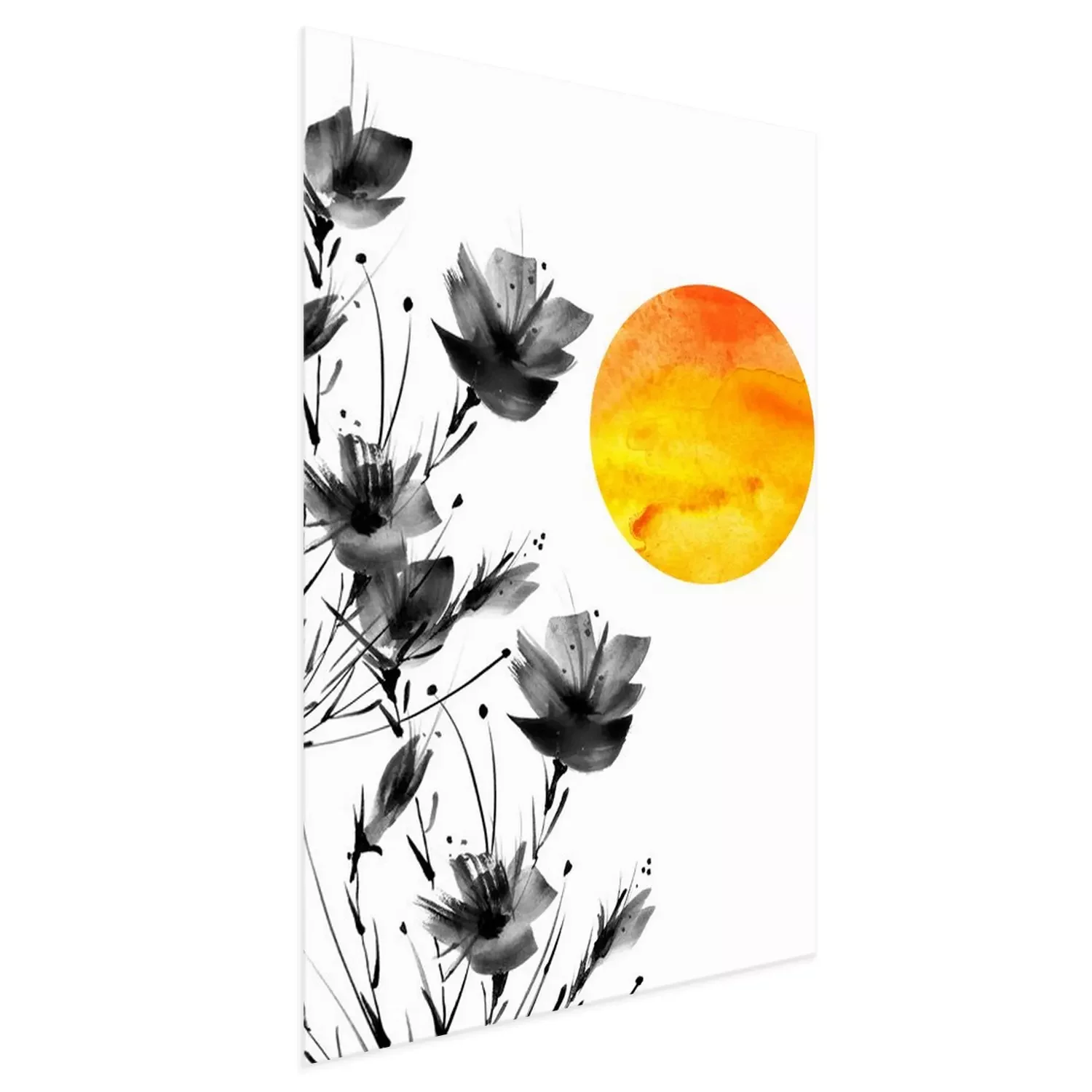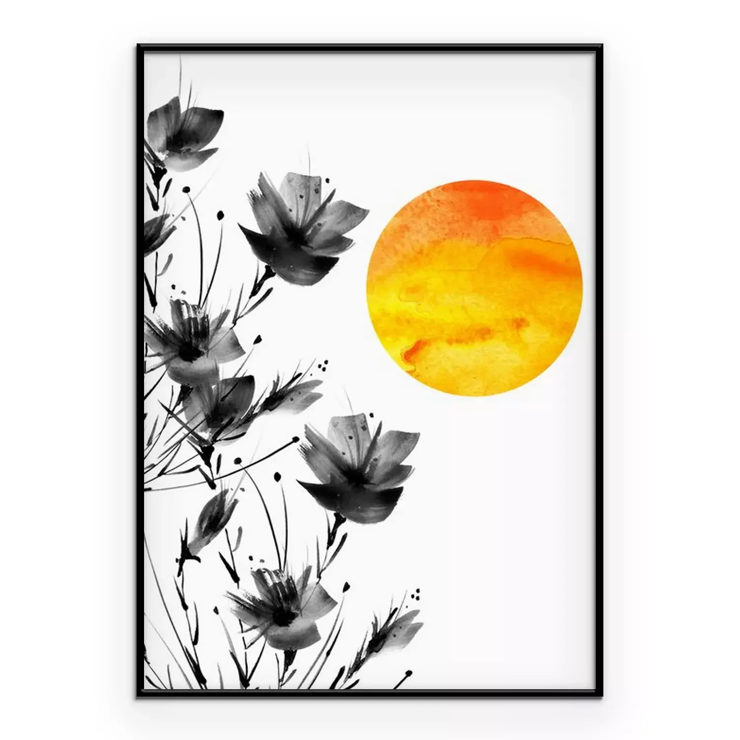 Poster: Zwarte klaprozen en oranjegele zon
