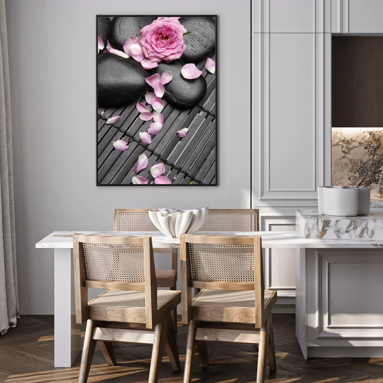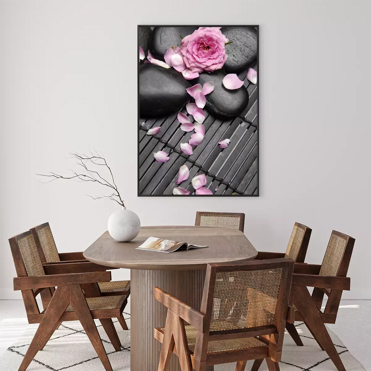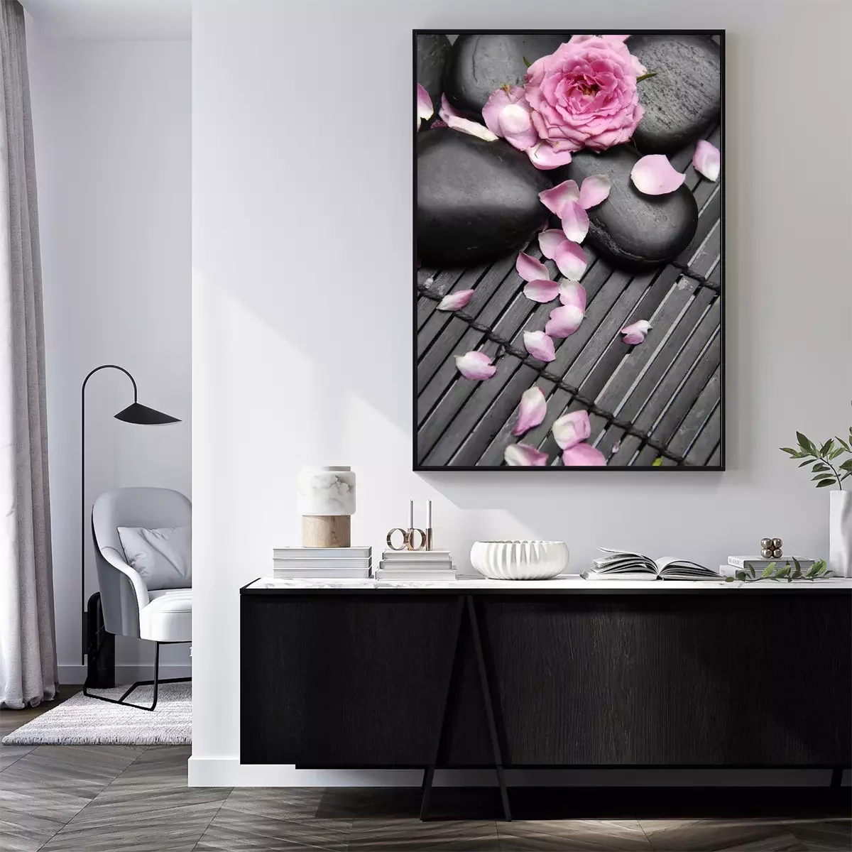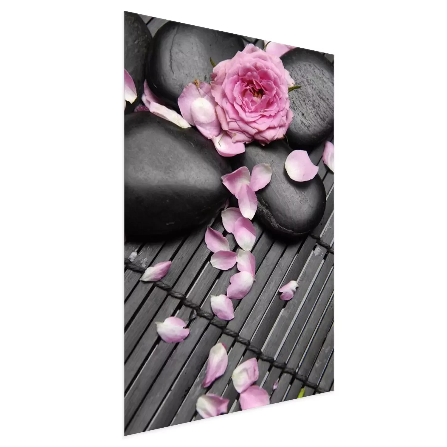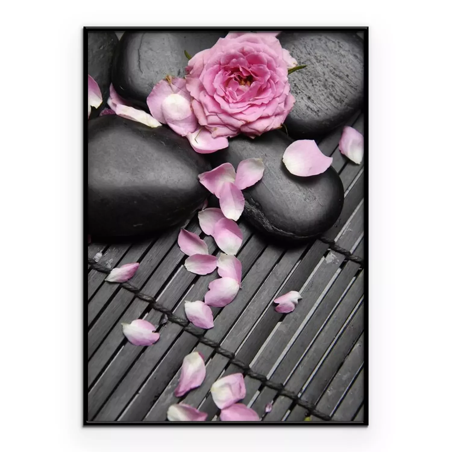 Poster: Zwarte stenen bestrooid met bloemblaadjes