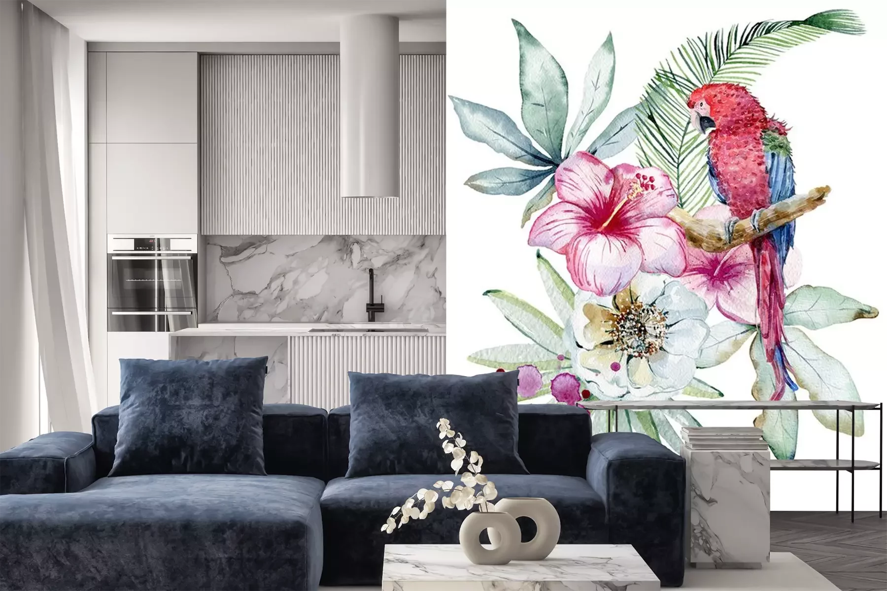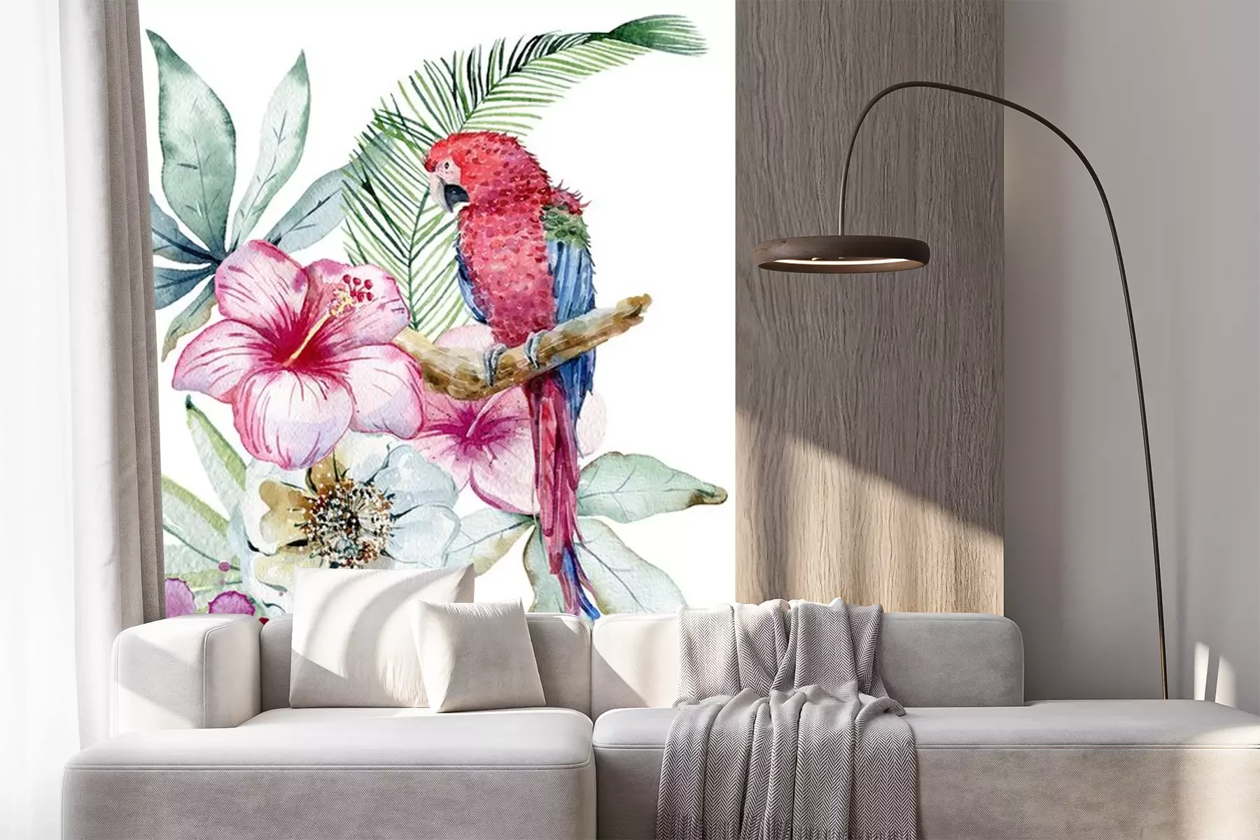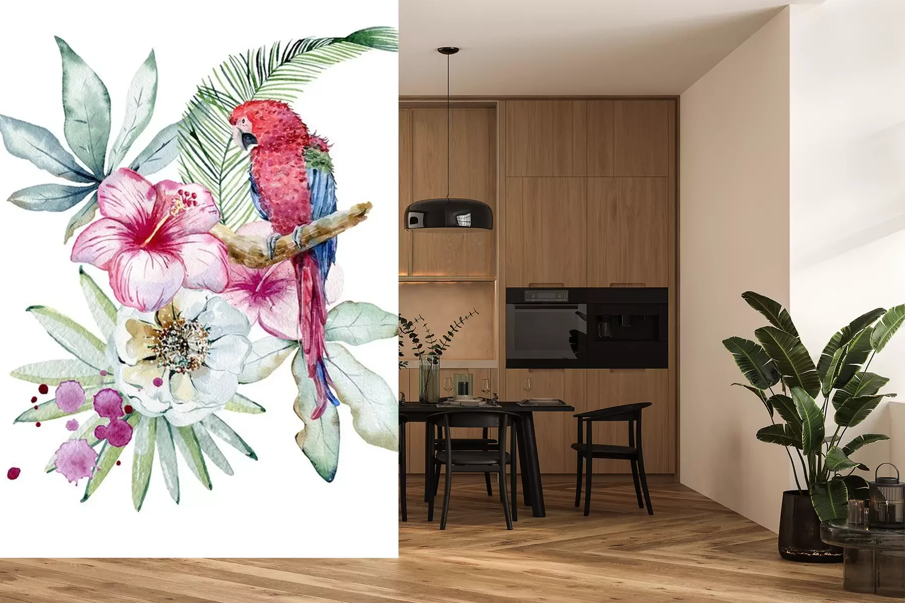 Sticker Afbeeldingen met tropische planten en een papegaai