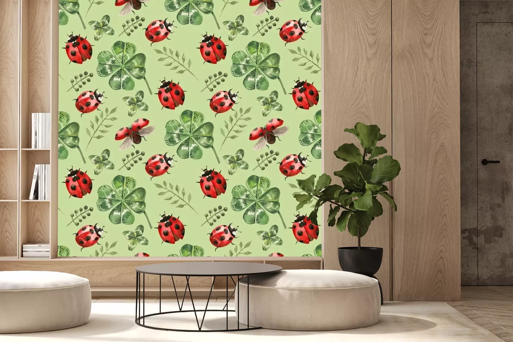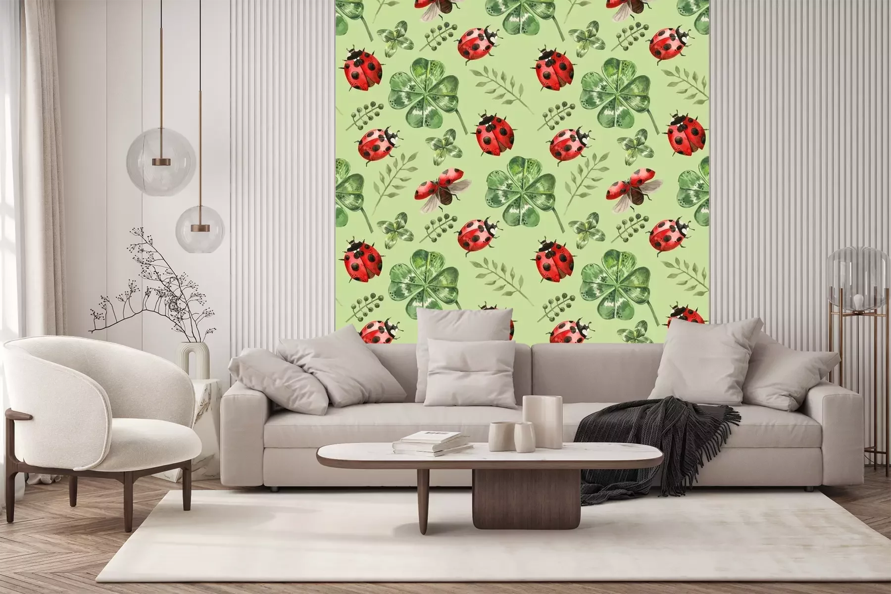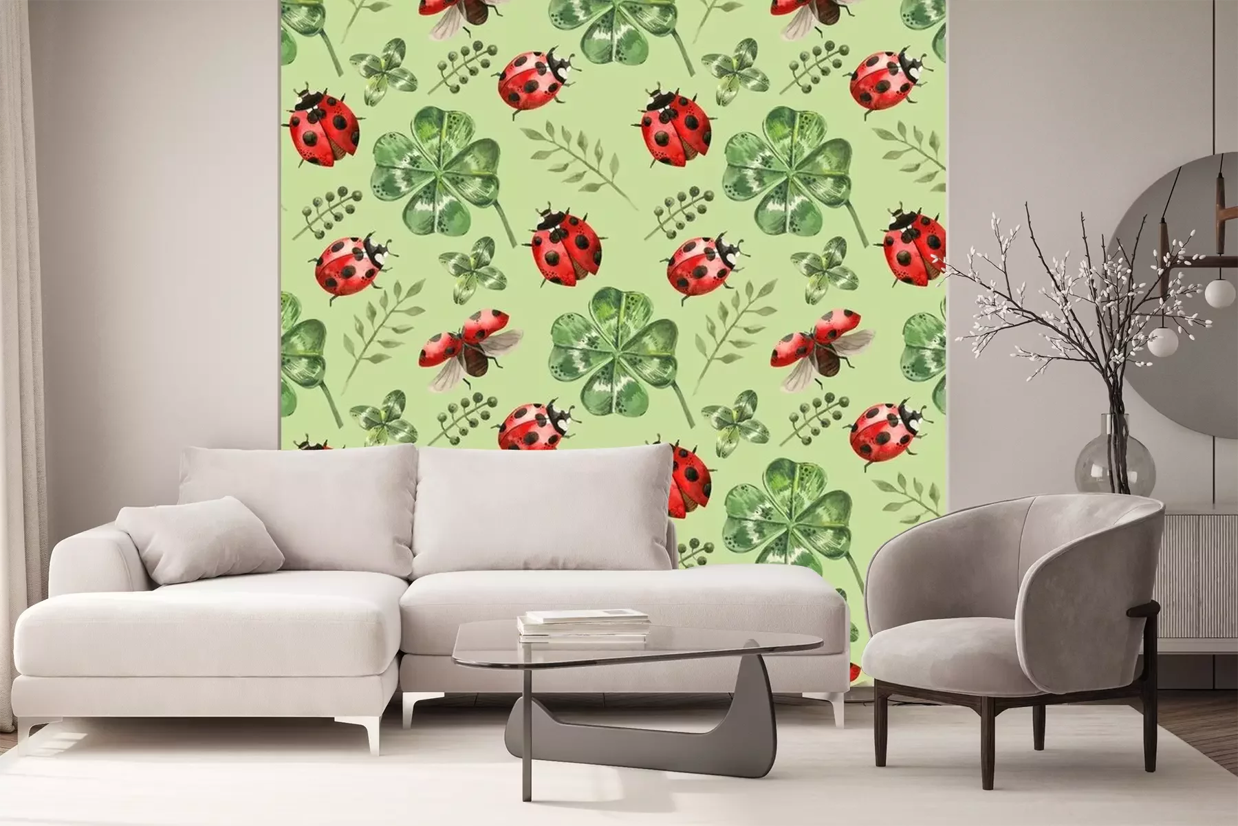 Sticker Aquarel lieveheersbeestjes tussen groene klavertjes