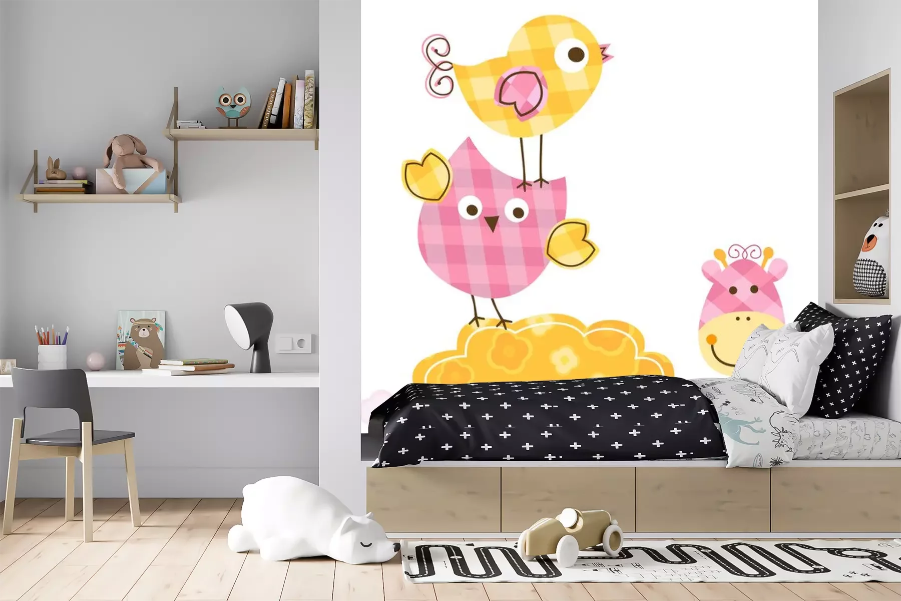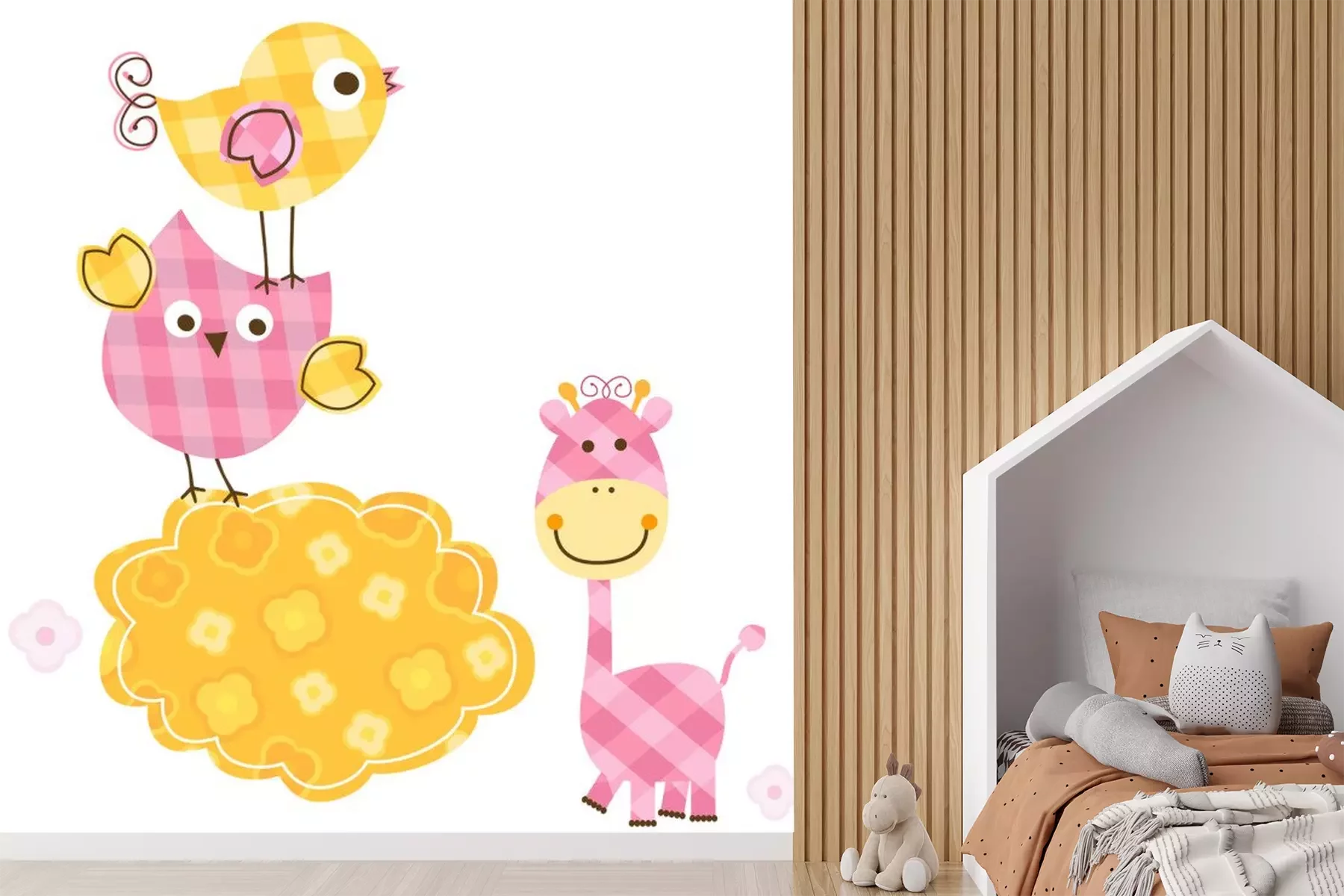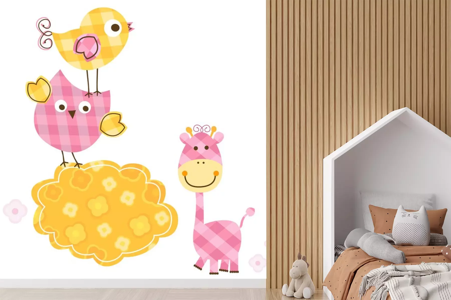 Gele geruite giraf onder vogelsProbleemloze bezorging verzorgd door vertrouwde vervoerders