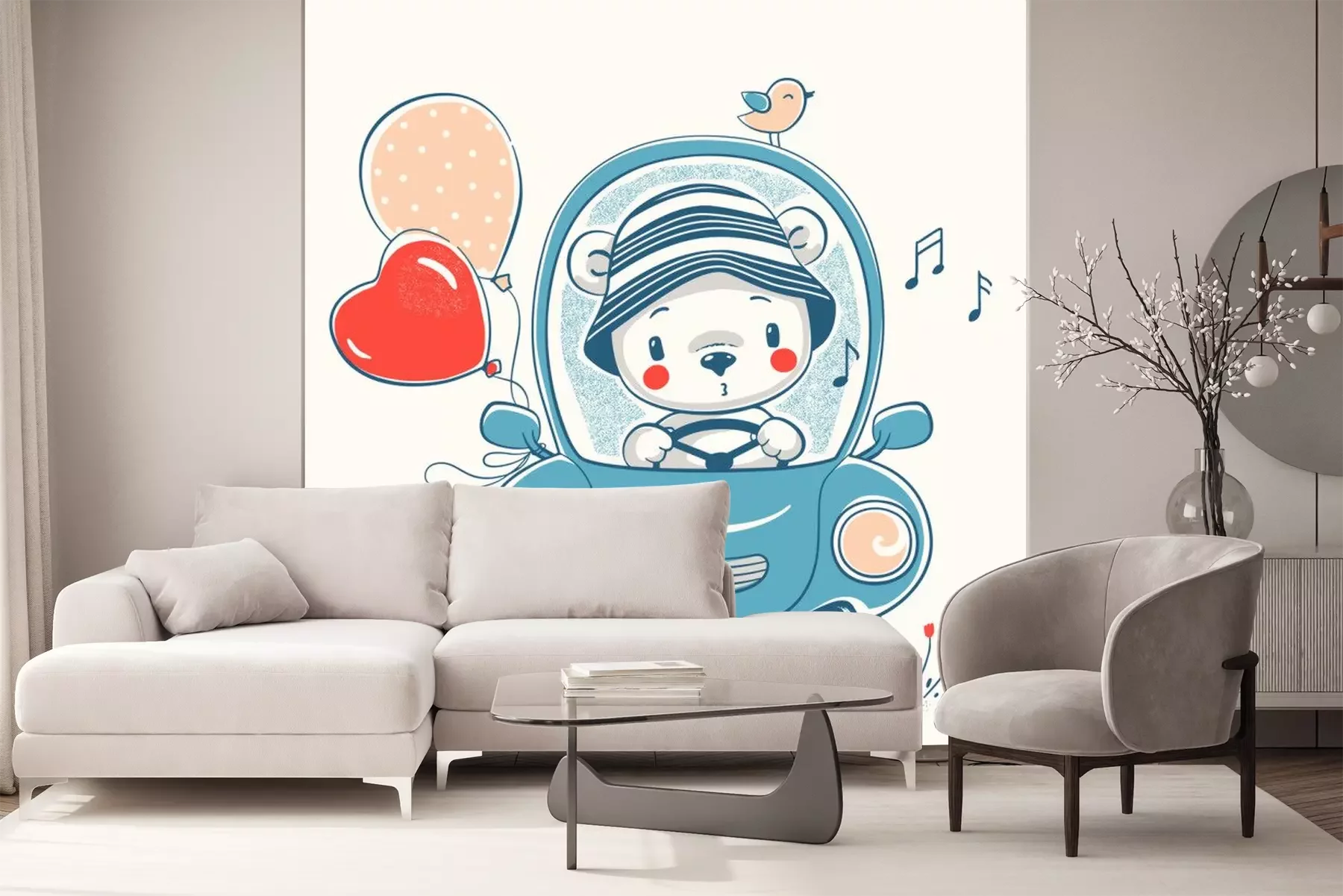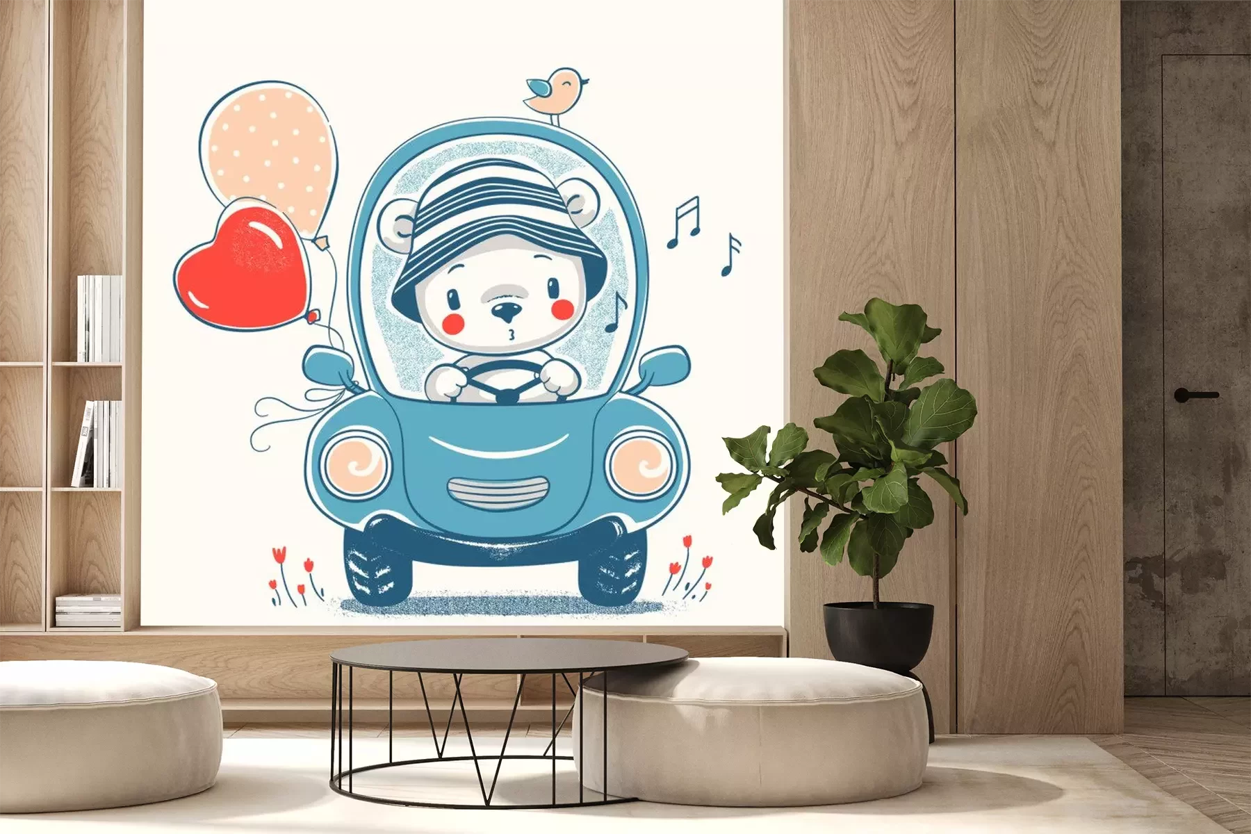 Sticker Cute baby bear driving car cartoon hand drawn vector illustration. Can be used for baby t-shirt print, fashion print design, kids wear, baby shower celebration greeting and invitation card.
