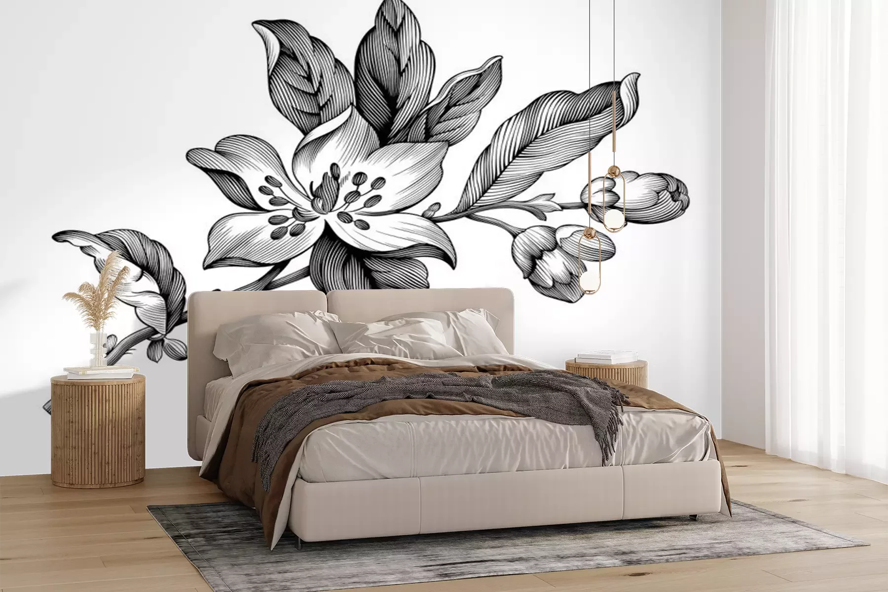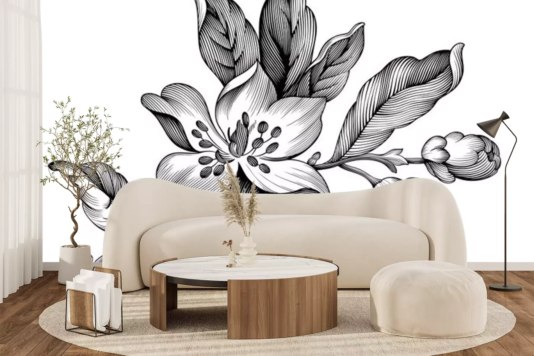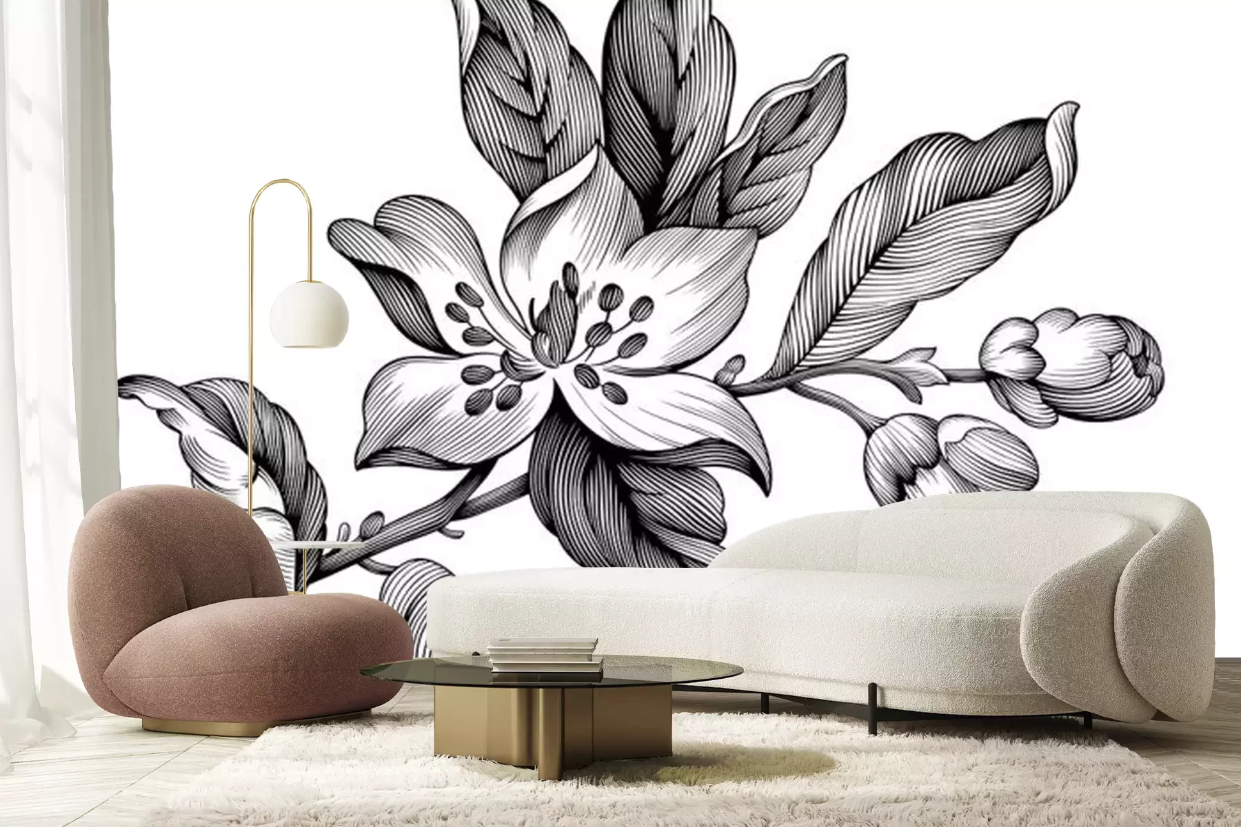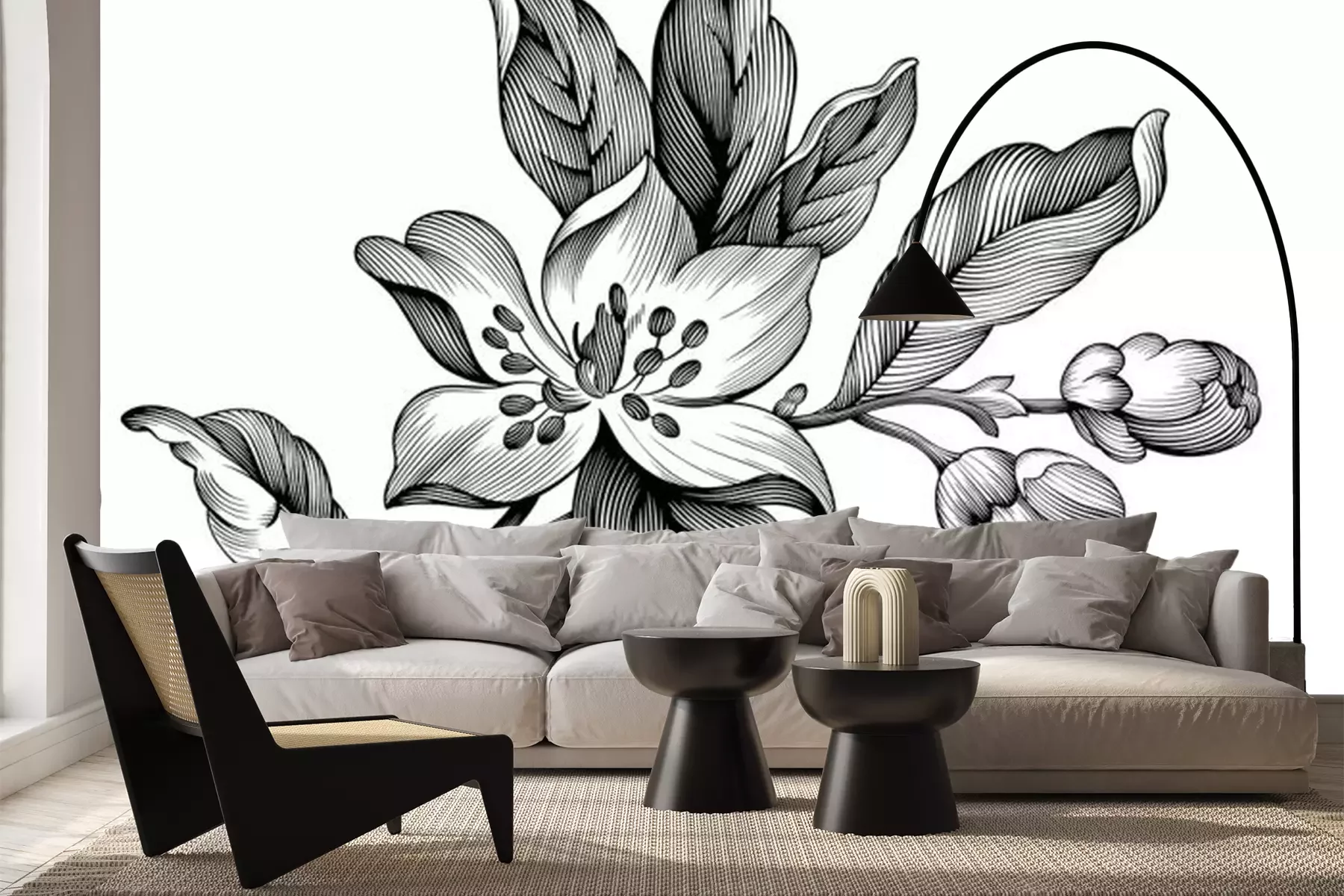 Sticker De zwart-witte appel komt floristische illustratie tot bloei