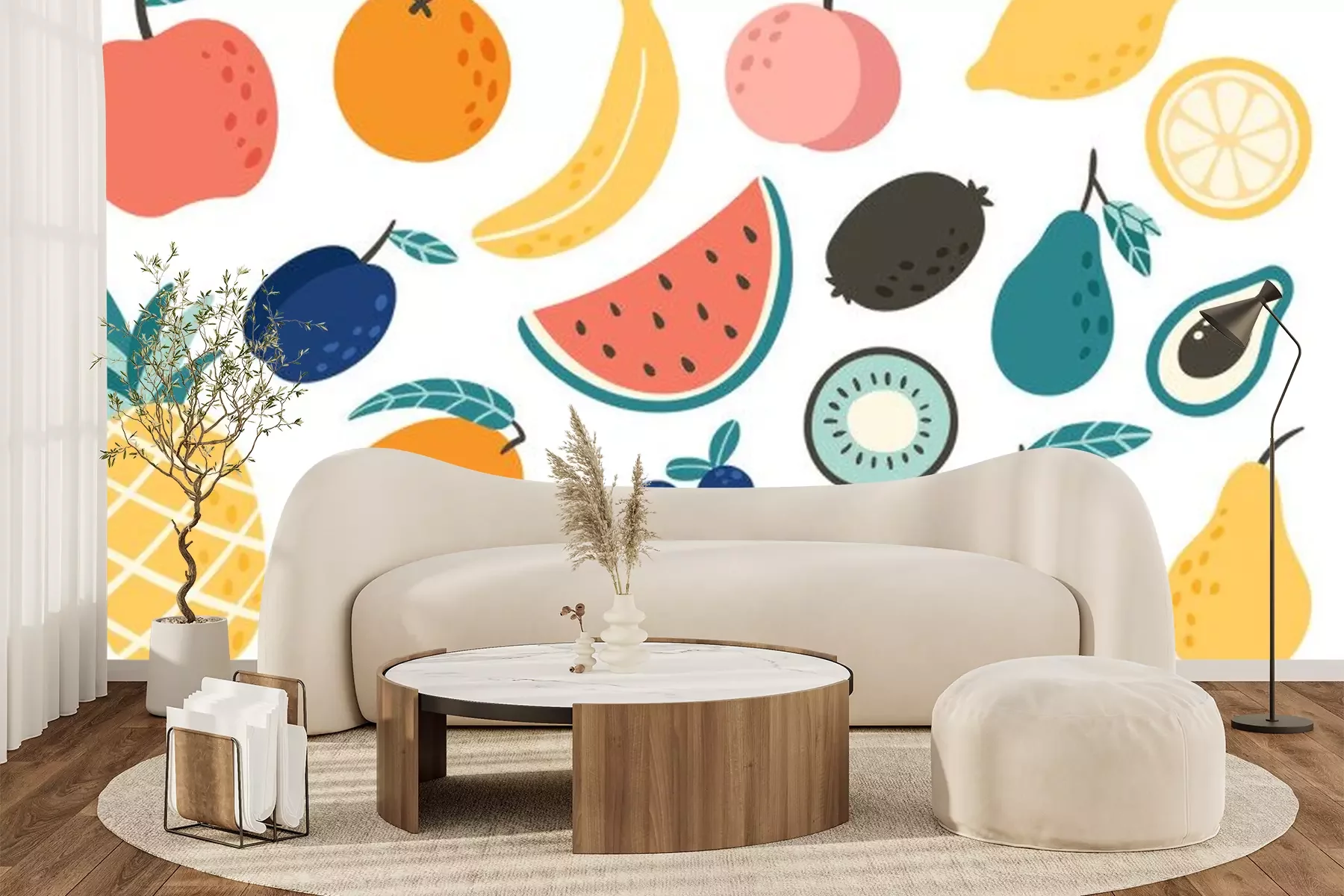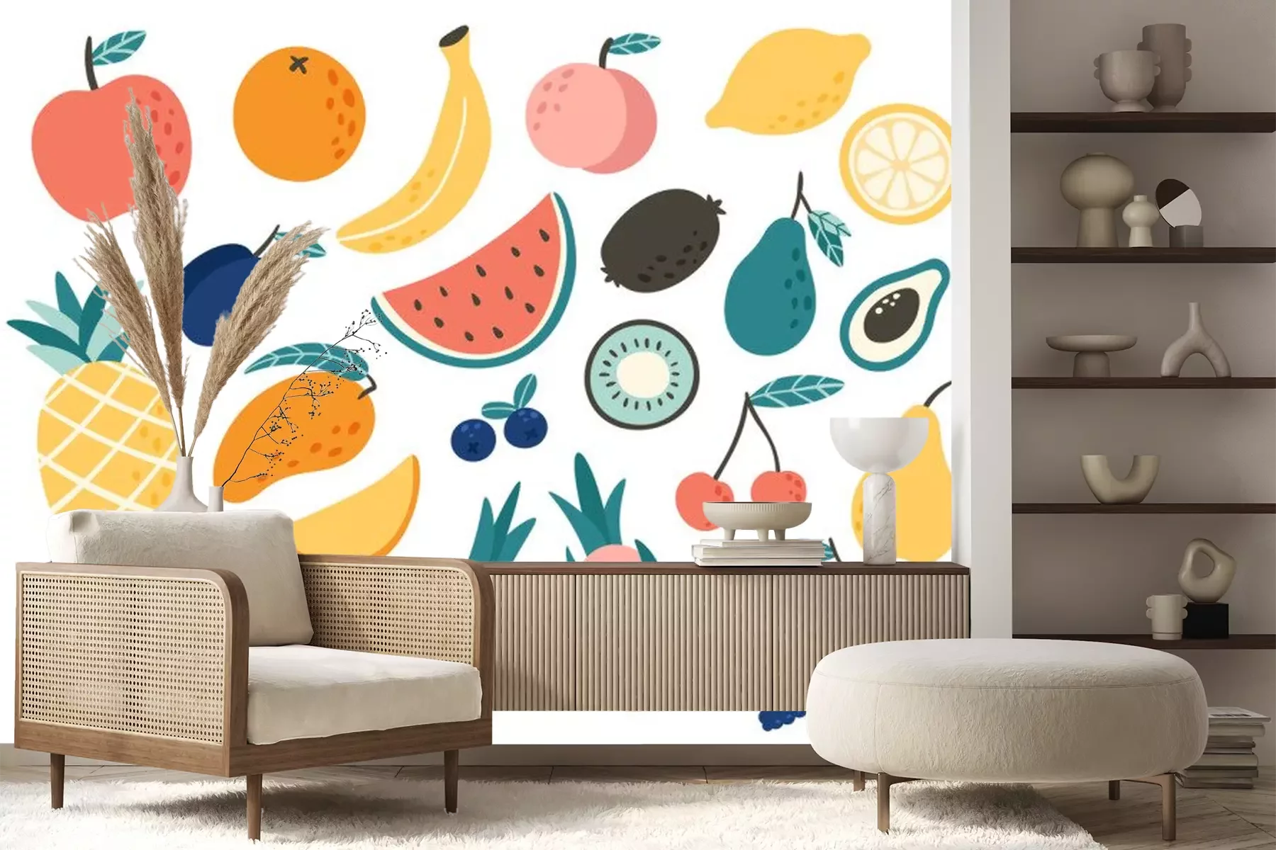 Sticker Doodle fruits. Natural tropical fruit, doodles citrus orange and vitamin lemon. Vegan kitchen apple hand drawn vector illustration