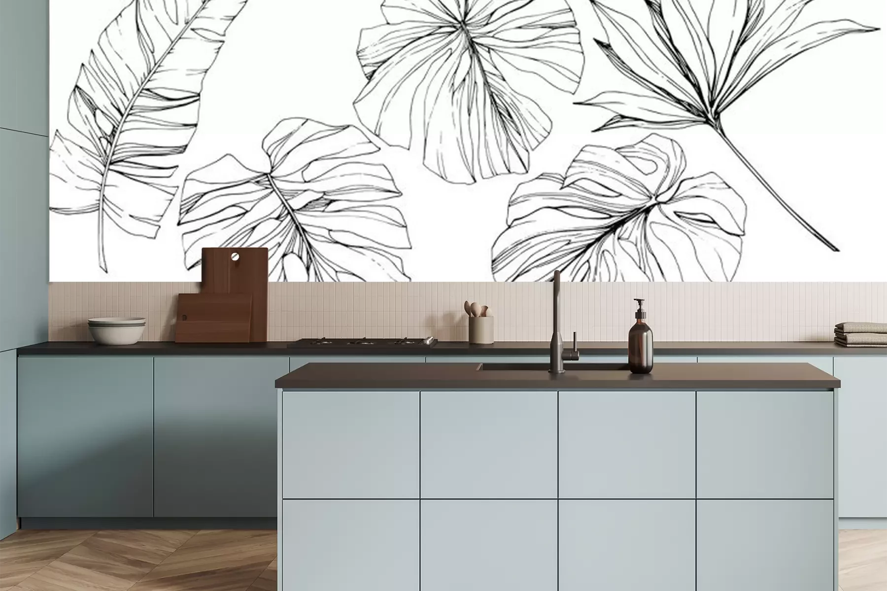 Sticker Exotische gekartelde bladeren zwart-wit tekeningen