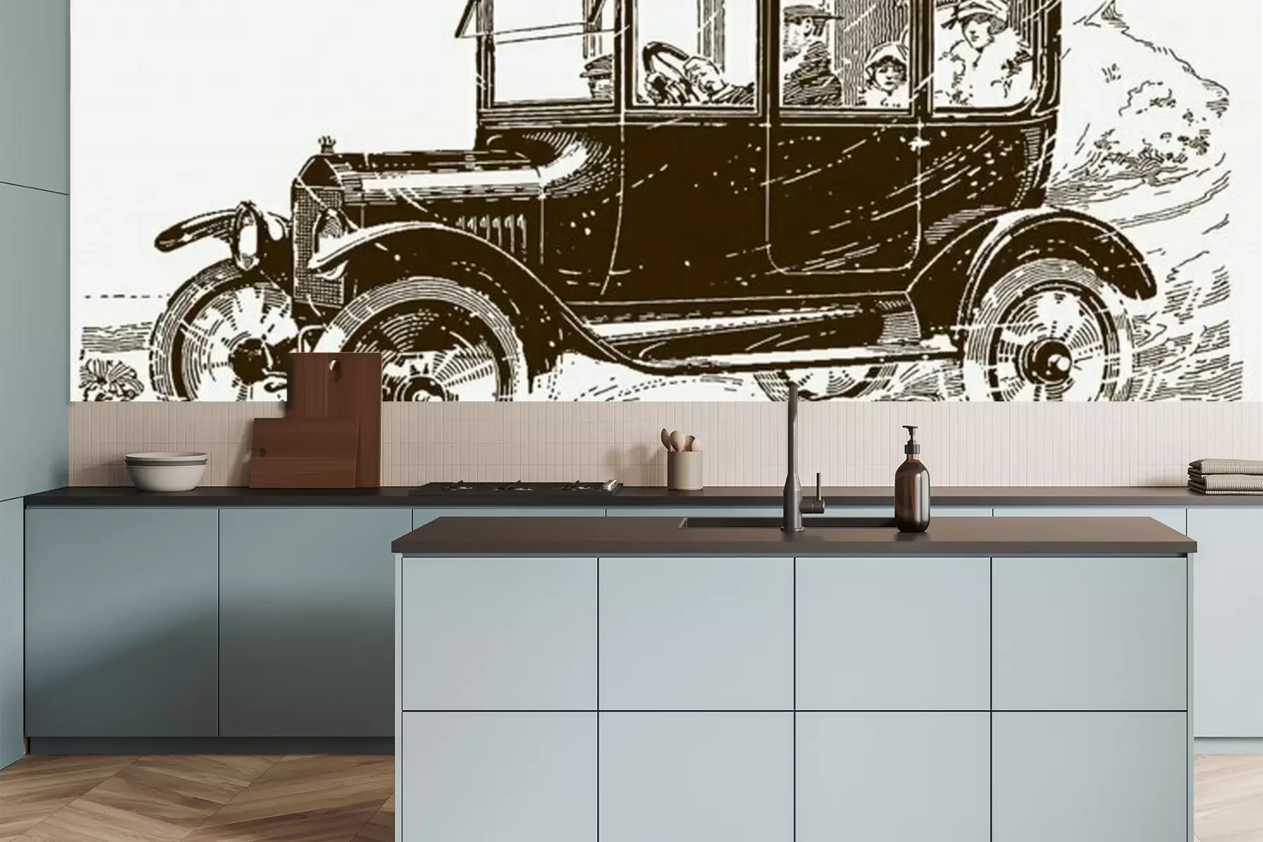Sticker Four people driving in a vintage car in a snowy landscape. Illustration after a historical engraving from the early 20th century