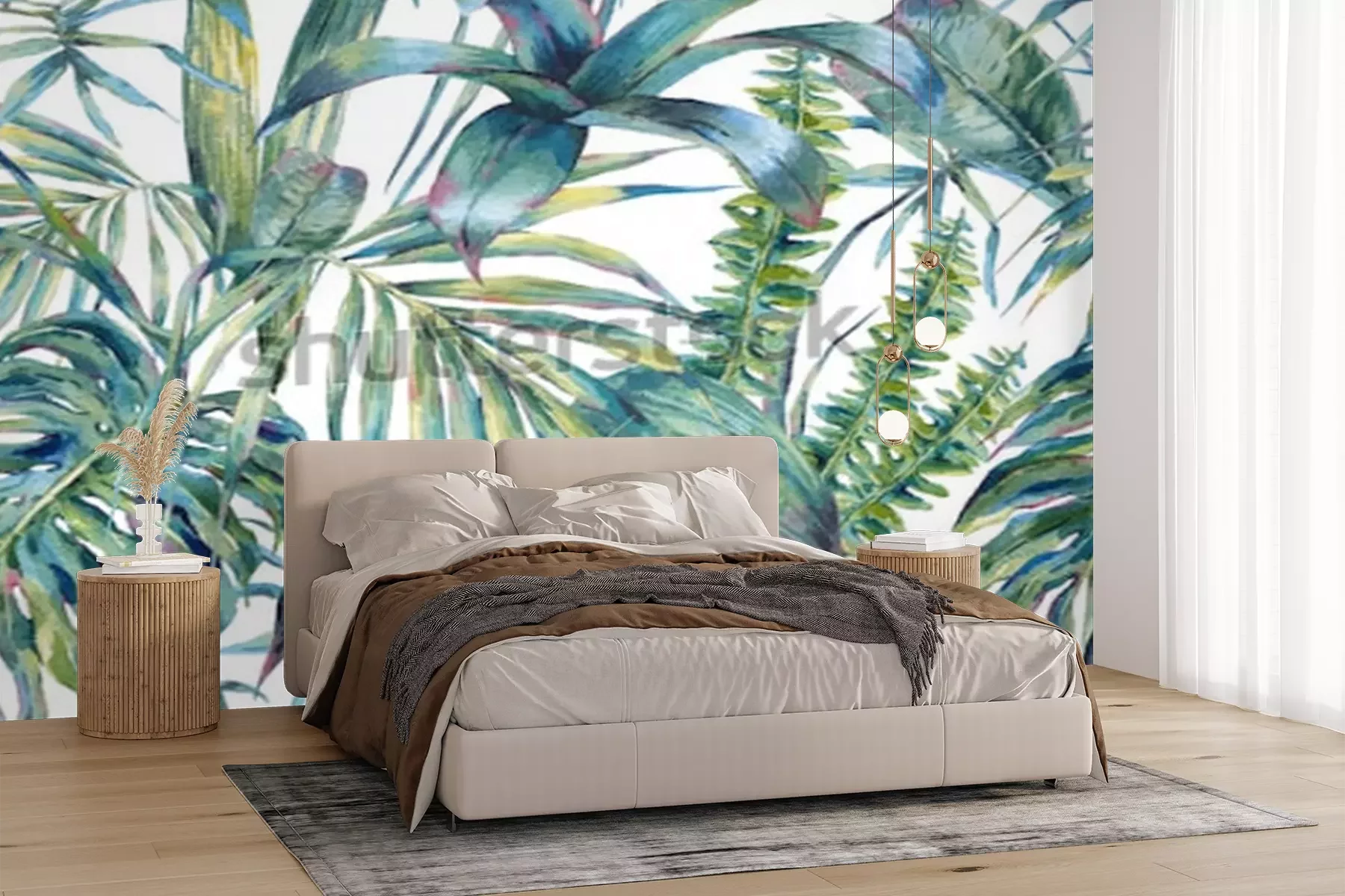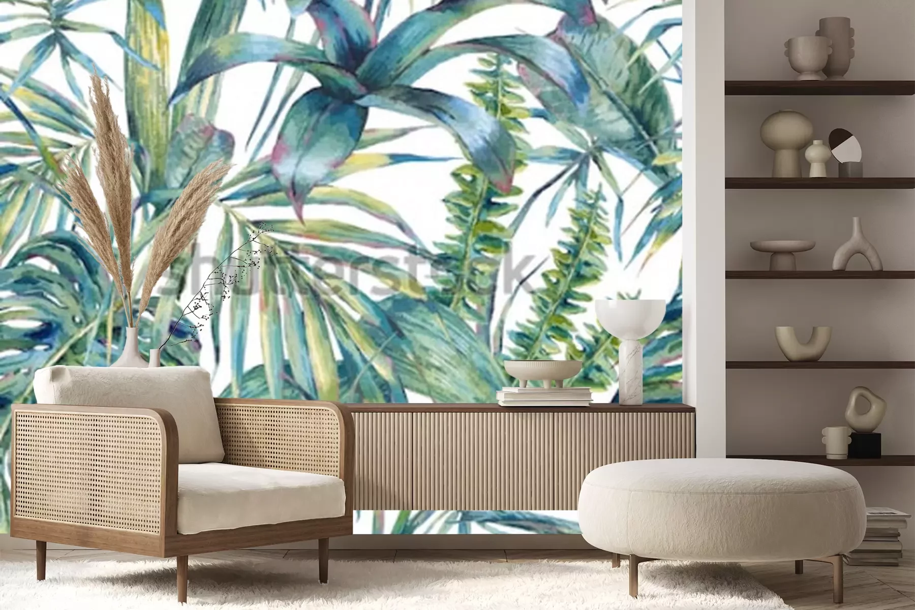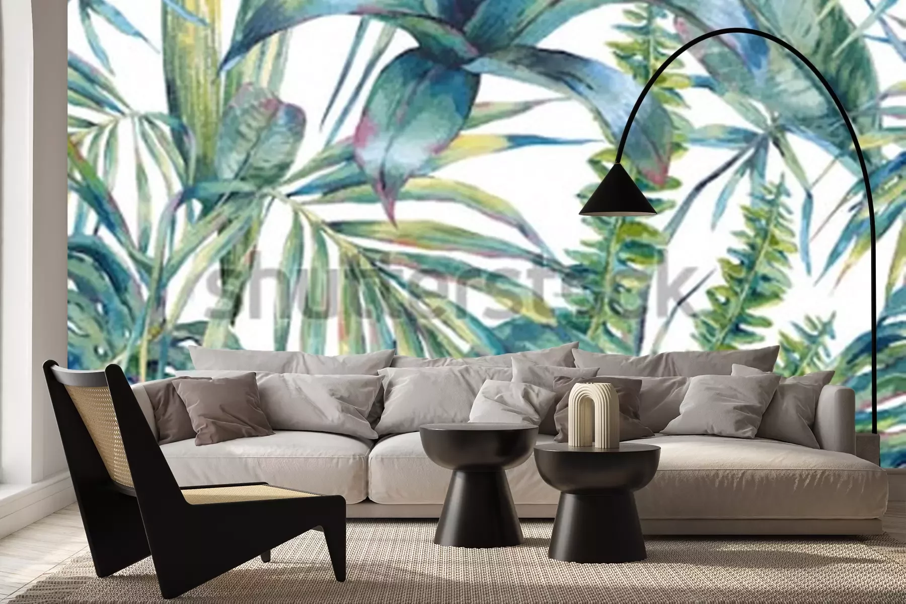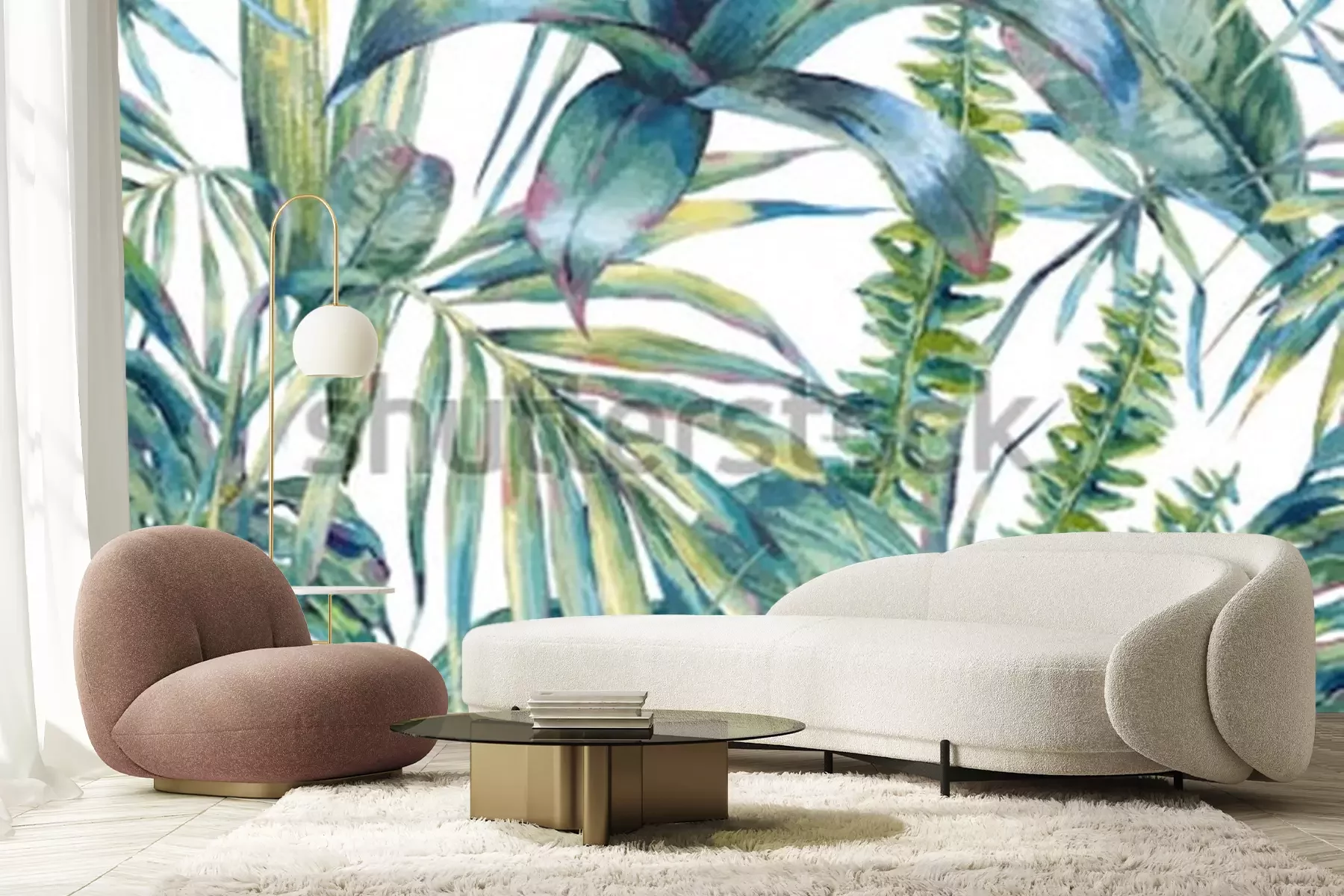 Sticker Het natuurlijke naadloze patroon van de bladeren exotische waterverf, groene tropische bladeren, varen, dichte wildernis, Hand geschilderde botanische de zomerillustratie op witte achtergrond