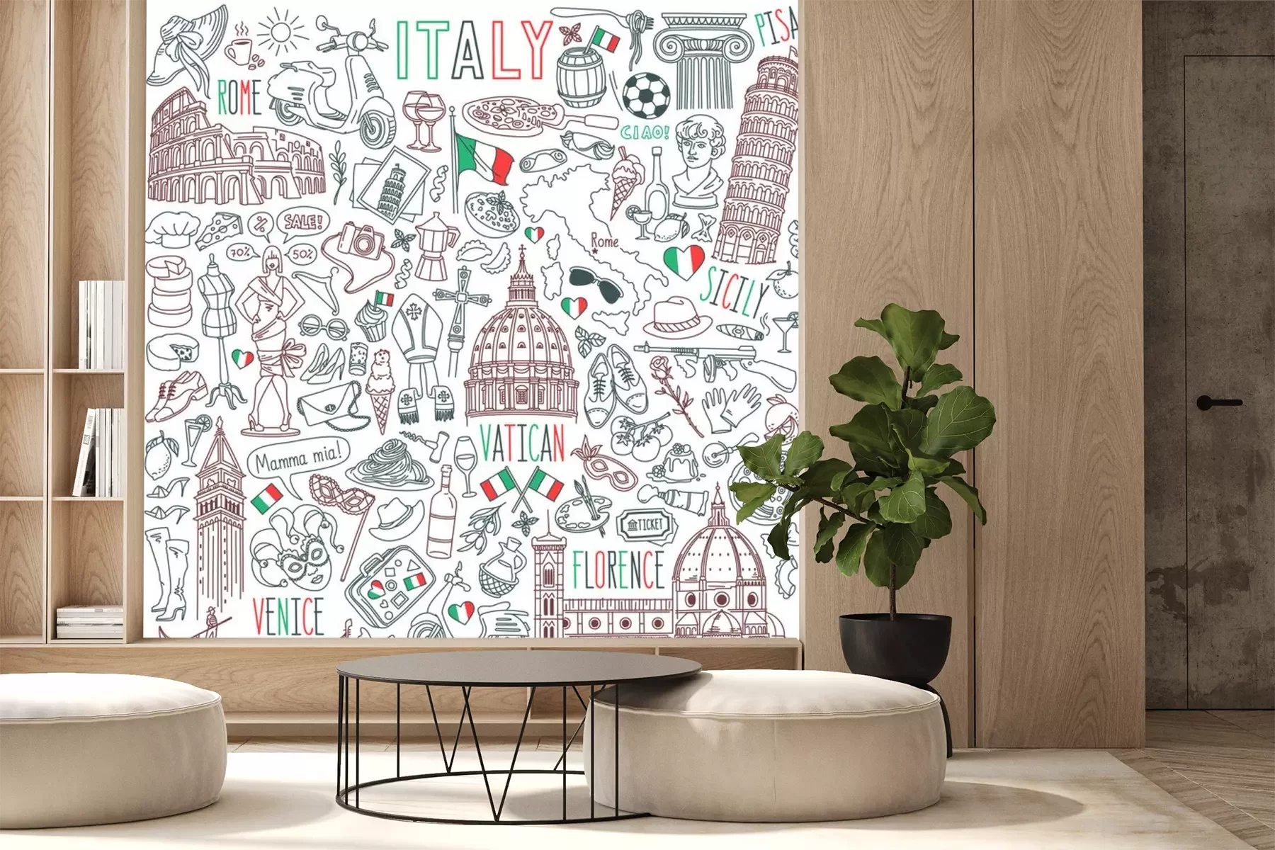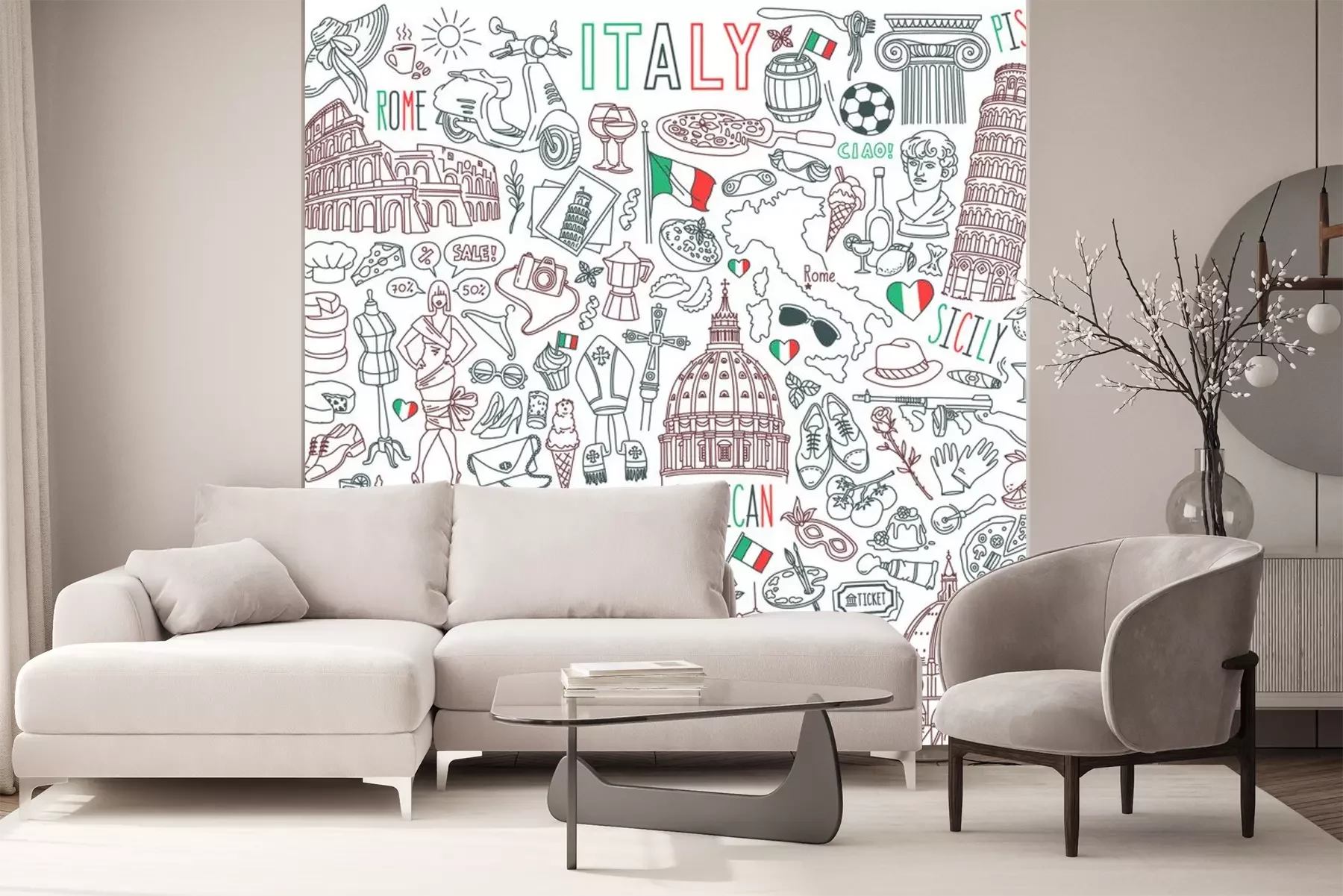 Sticker Italy doodle set. Famous landmarks and traditional Italian symbols - architecture, cuisine, Venice carnival. Objects isolated on white background