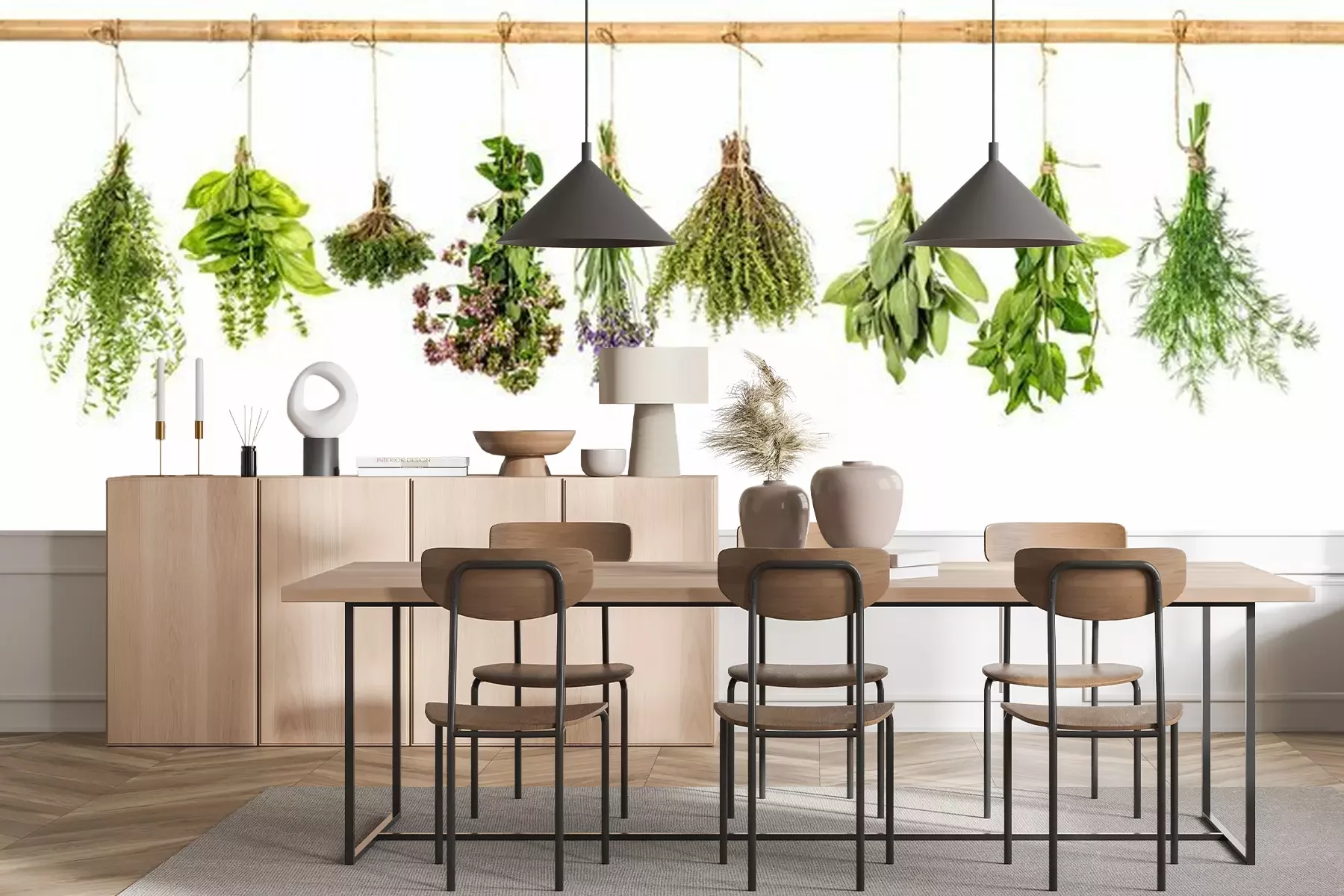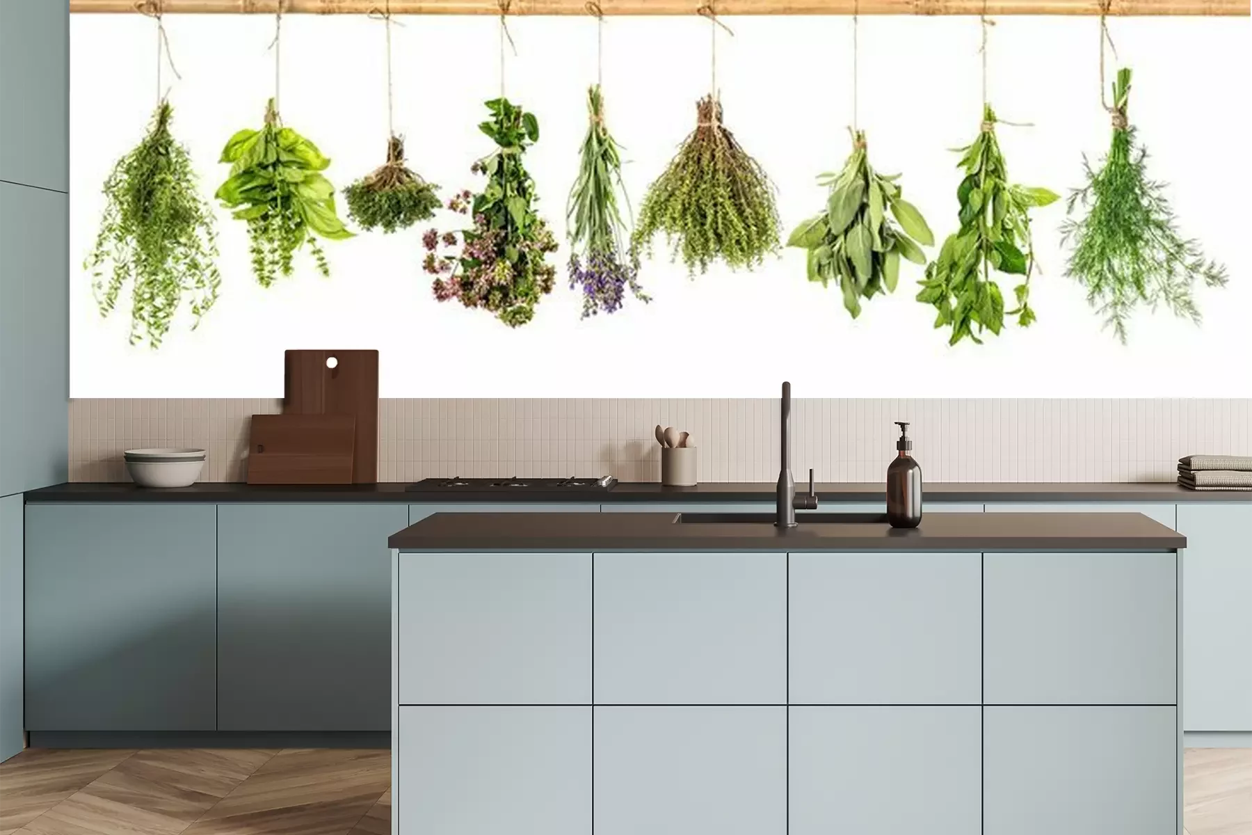 Groene kruidenbosjes hangen aan een takFotobehang