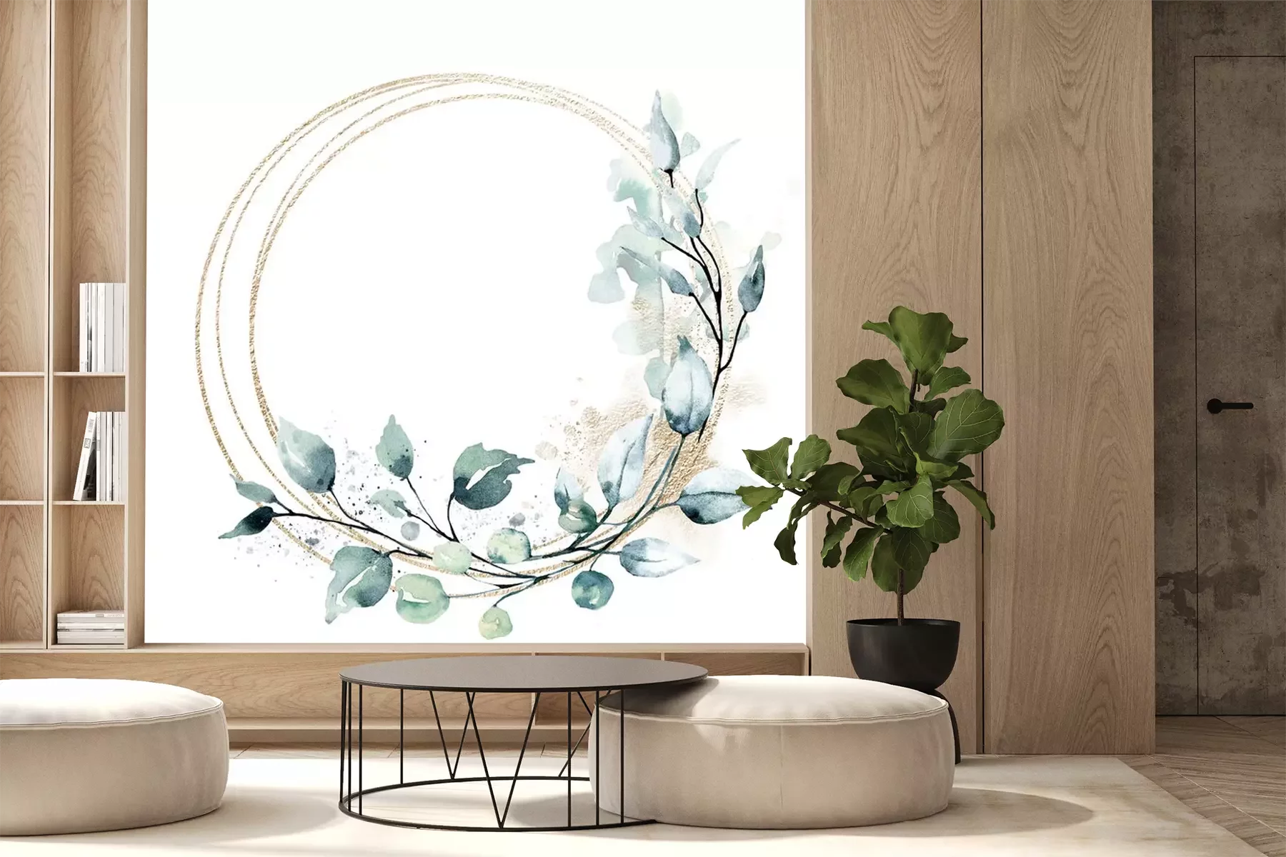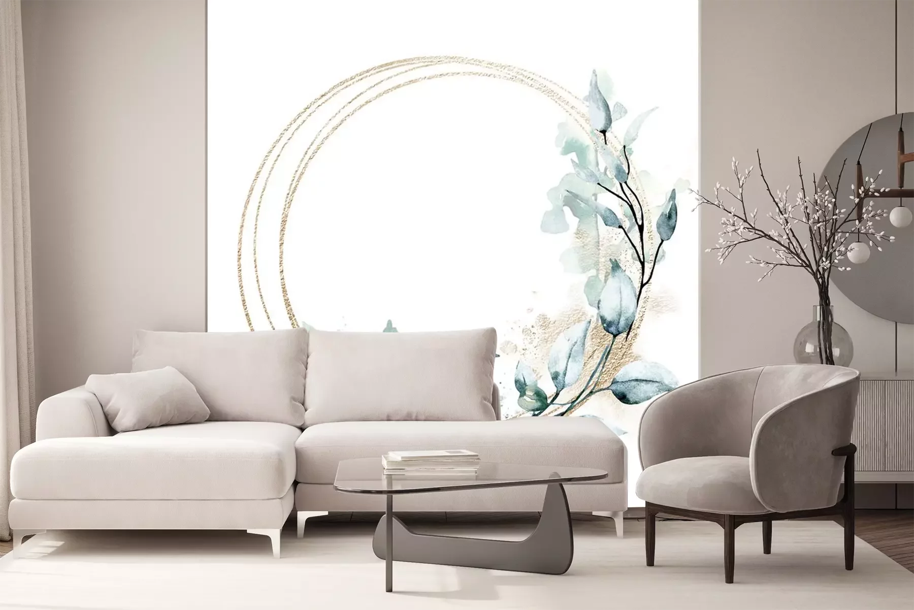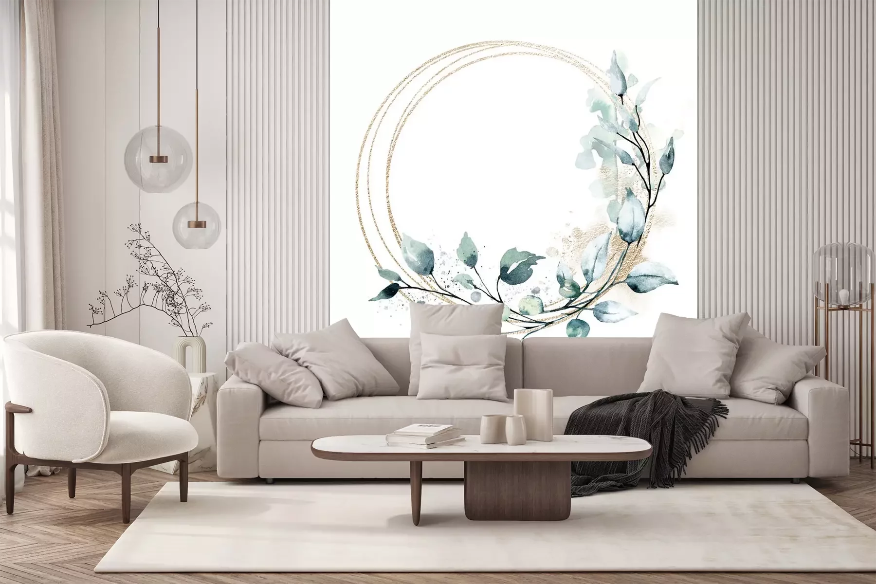 Sticker Leaves gold frame wreath border. Watercolor hand painting floral geometric background. Leaf, plant, branch isolated on white background.