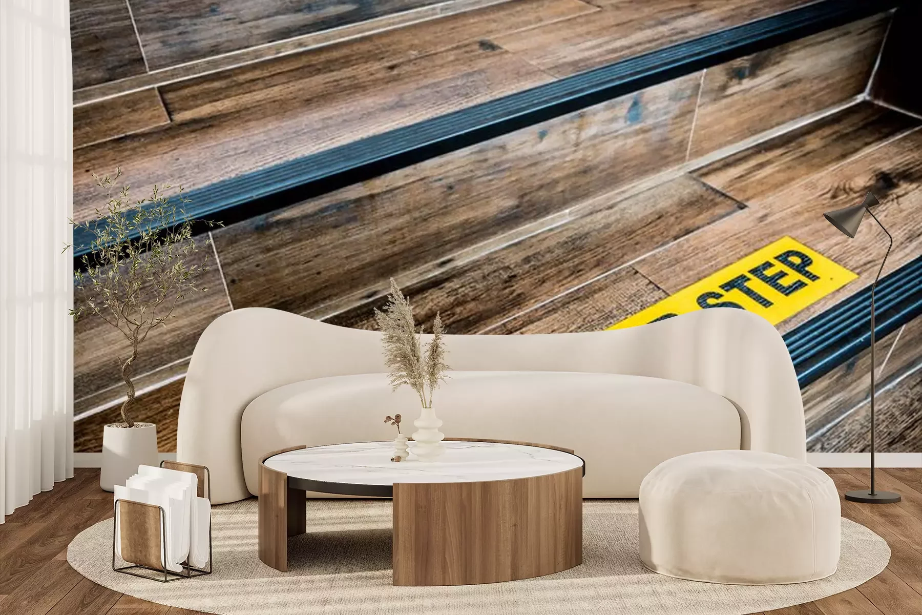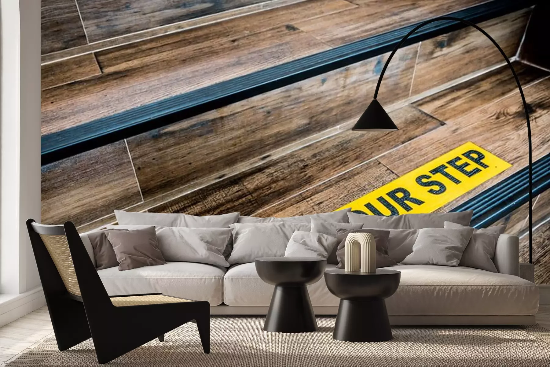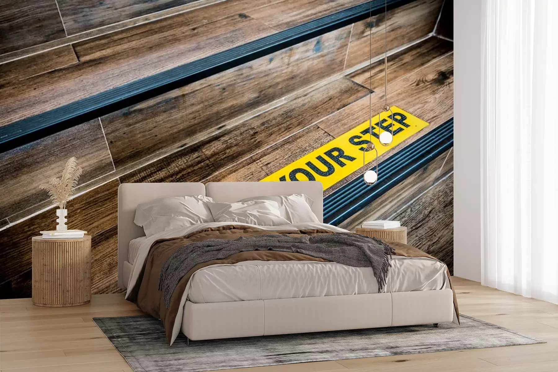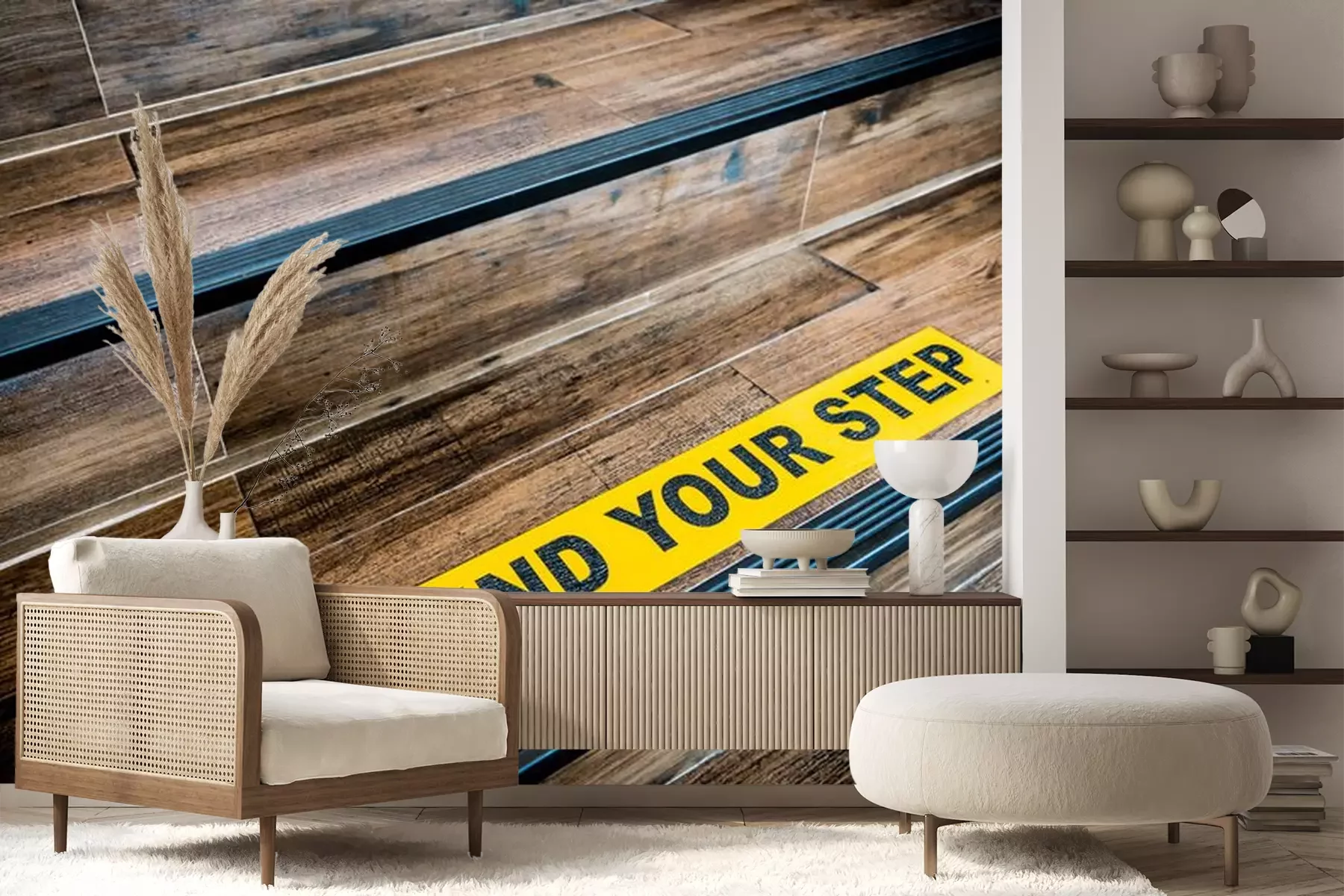 Sticker Let op dat je stapstickerbord op houten trap is geplakt. Waarschuwingen, abstracte of binnen-architectuurconcept