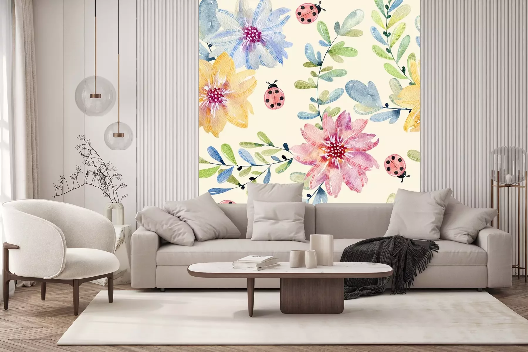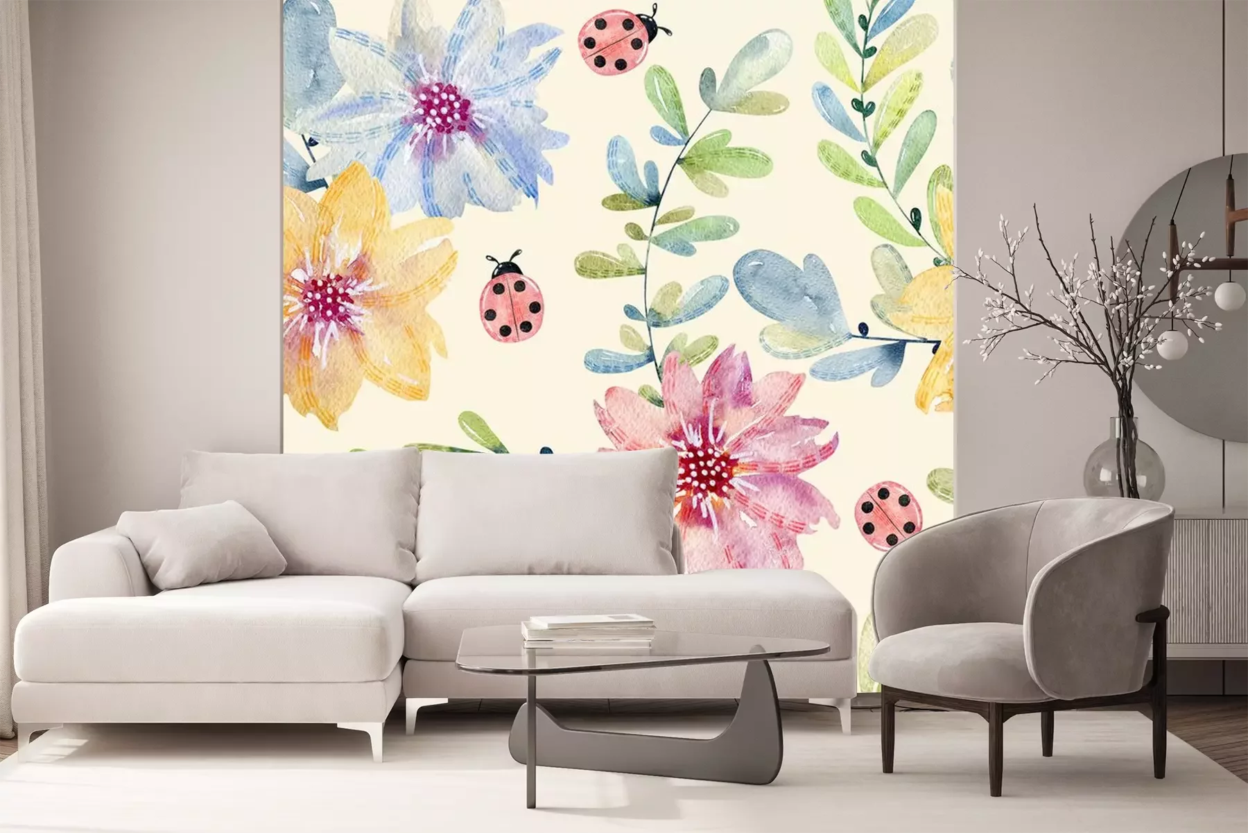 Sticker Lieveheersbeestjes tussen kleurrijke aquarel bloemen