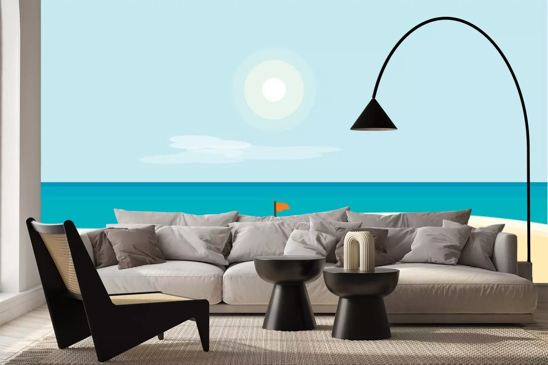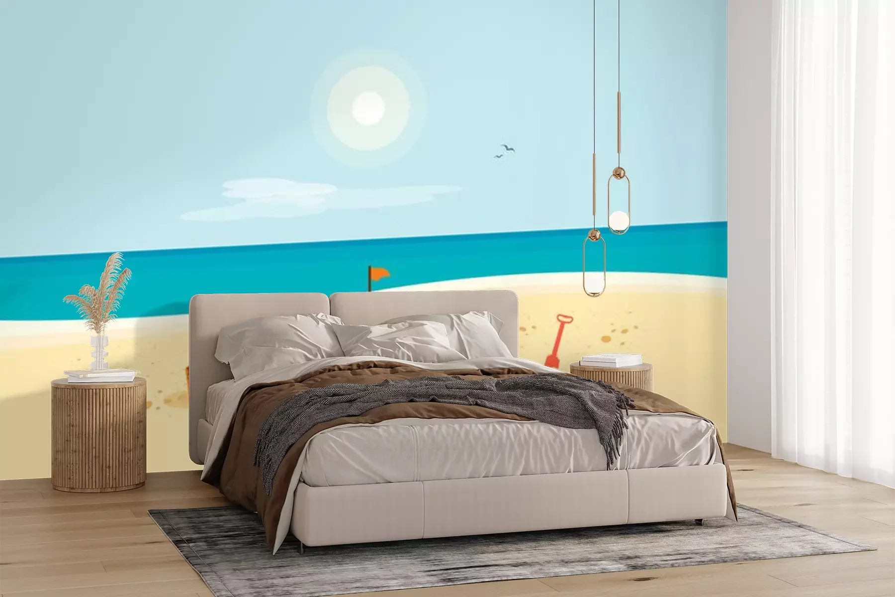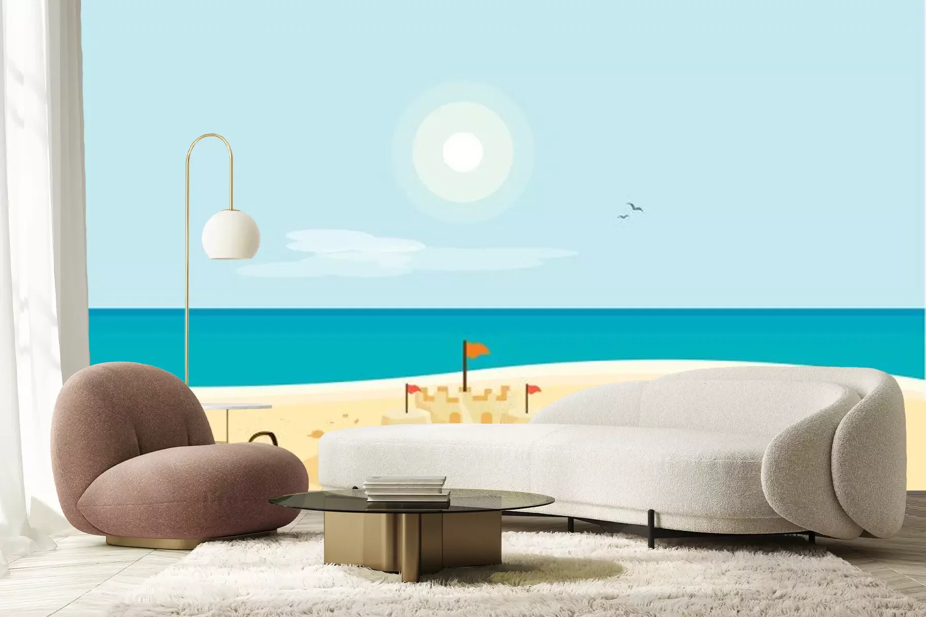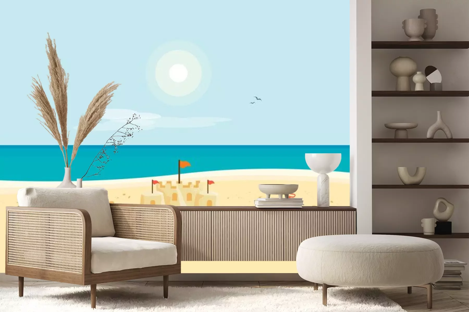 Sticker Lonely sand castle on sandy beach with blue sea ocean water and coast line clear summer sunny sky in background. Kid toys left on sand on holiday. Minimalist cartoon style flat vector illustration.