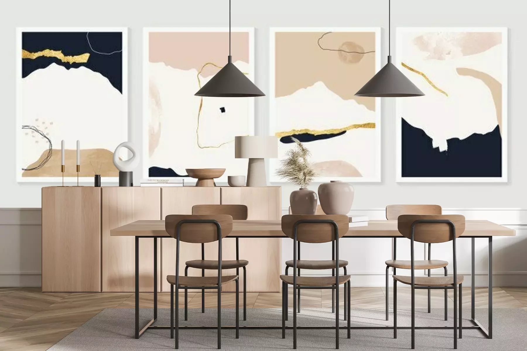 Sticker Luxury Gold Mountain wall art vector set. Earth tones landscapes backgrounds set with moon and sun.  Abstract Plant Art design for print, cover, wallpaper, Minimal and  natural wall art.