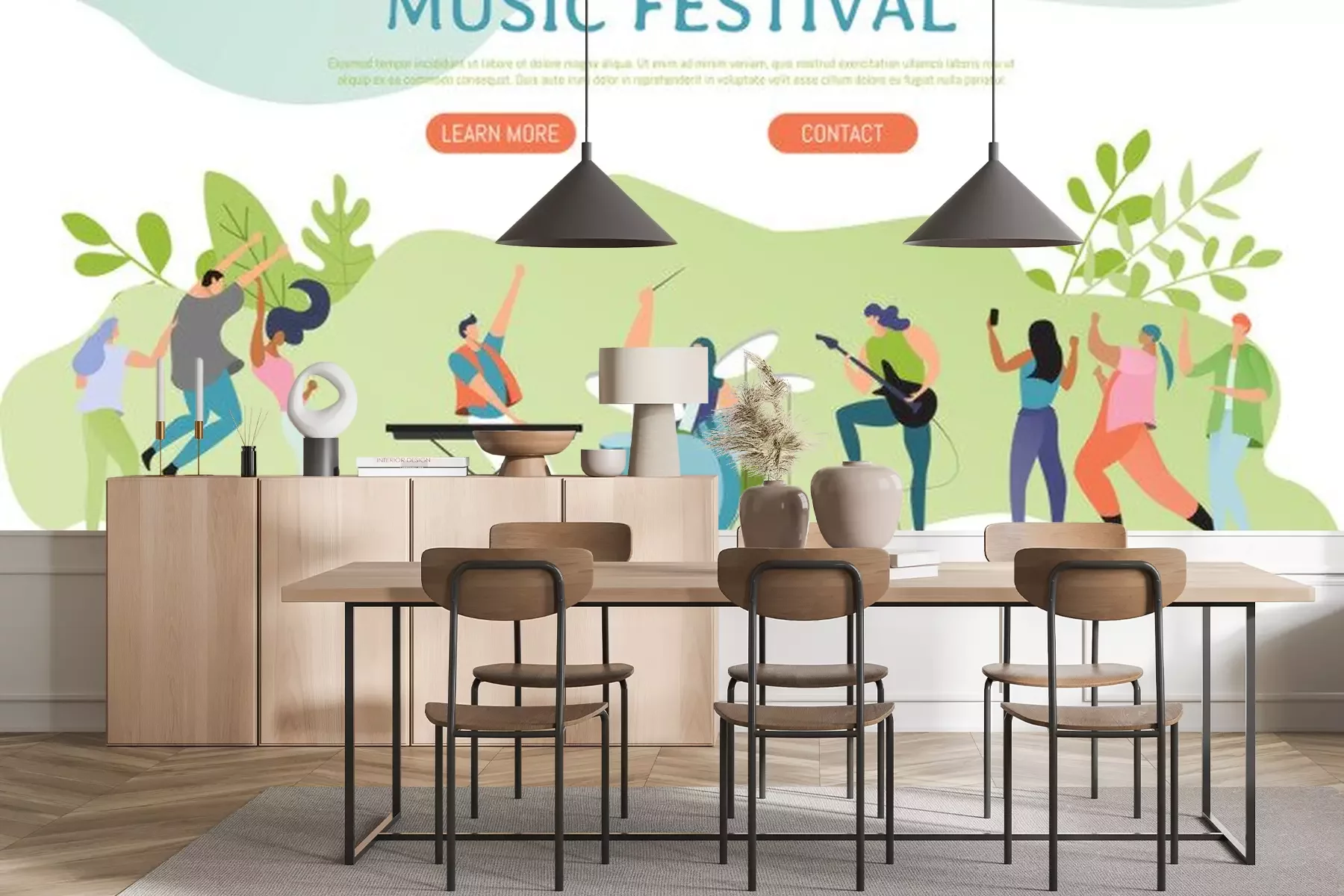 Sticker Music festival poster, people on concert, rock band website concept, vector illustration. Men and women cartoon characters in flat style playing musical instruments, drums, guitar and piano keyboard