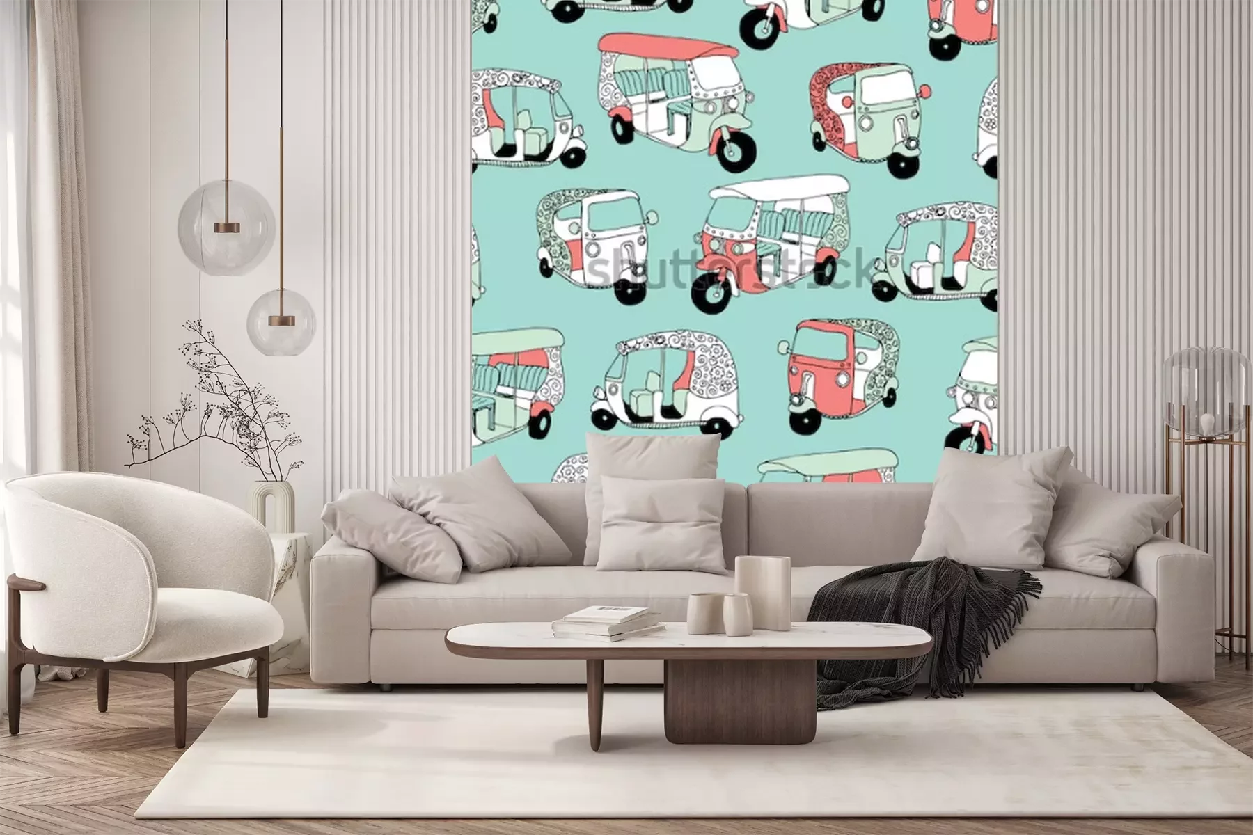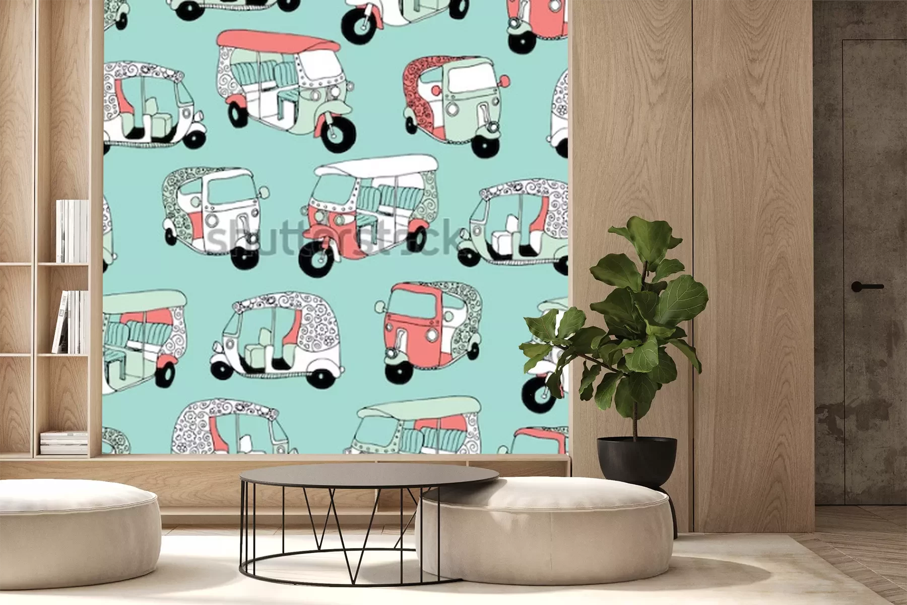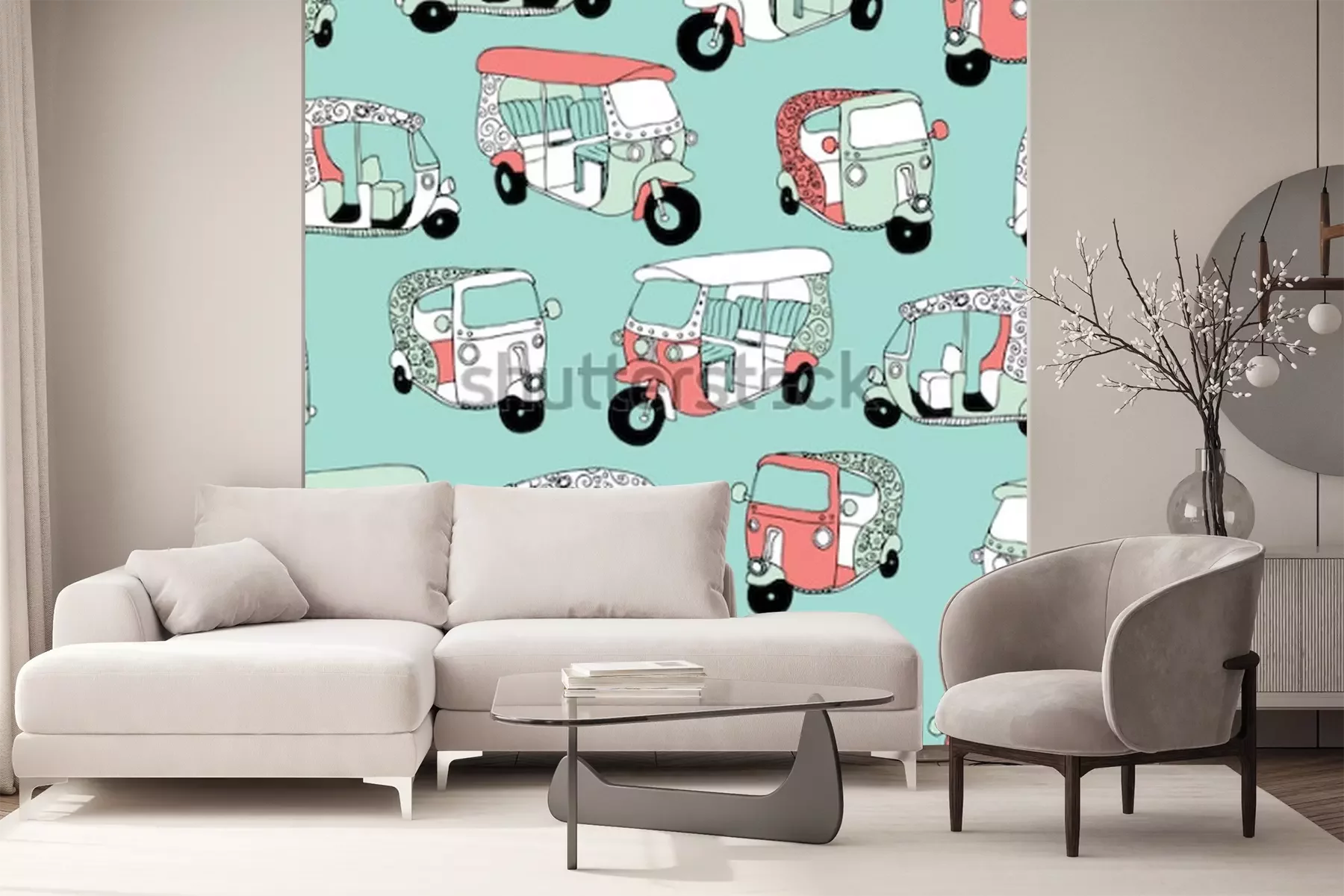 Sticker Naadloze Aziatische de koningin van India van het vervoerspictogram van het de achtergrond van de wegriksja illustratie patroon in vector