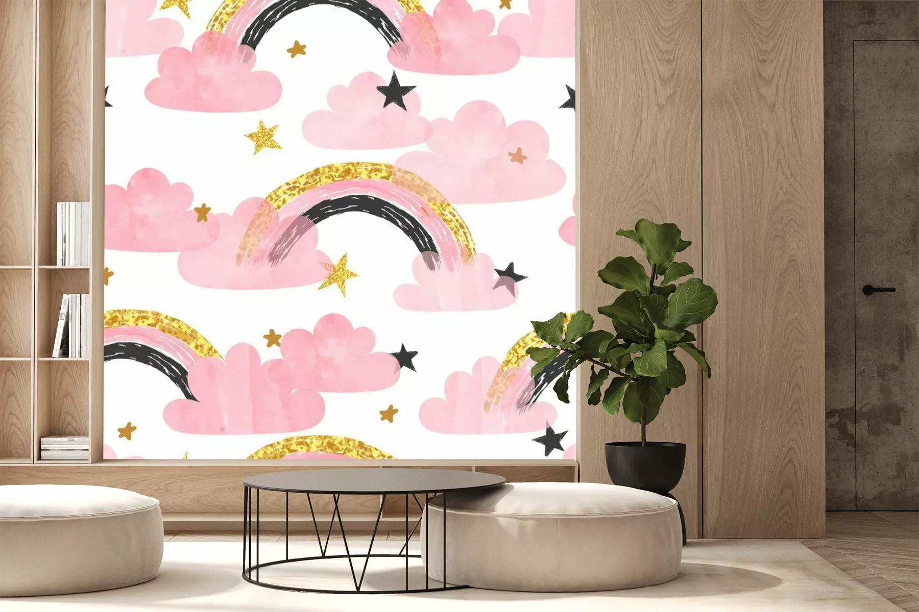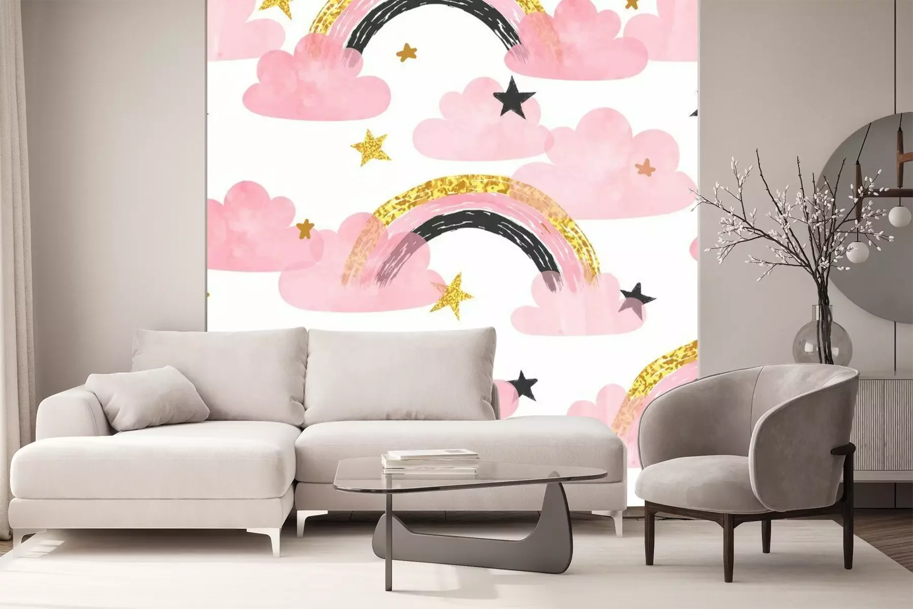 Sticker Regenbogen tussen roze wolken en sterren