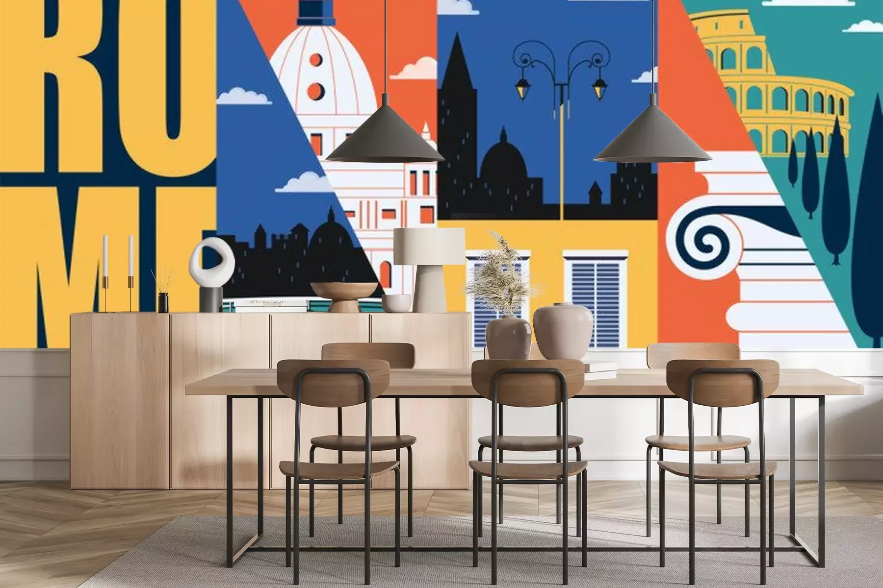 Sticker Rome, Italy vector banner, illustration. City skyline, historical buildings in modern flat design