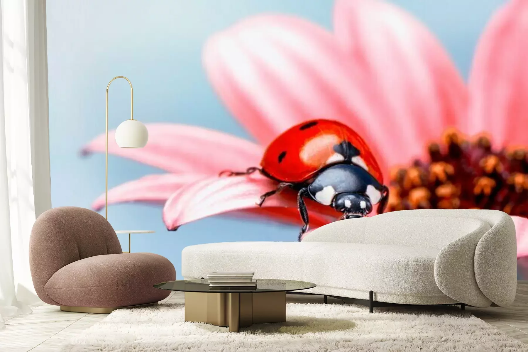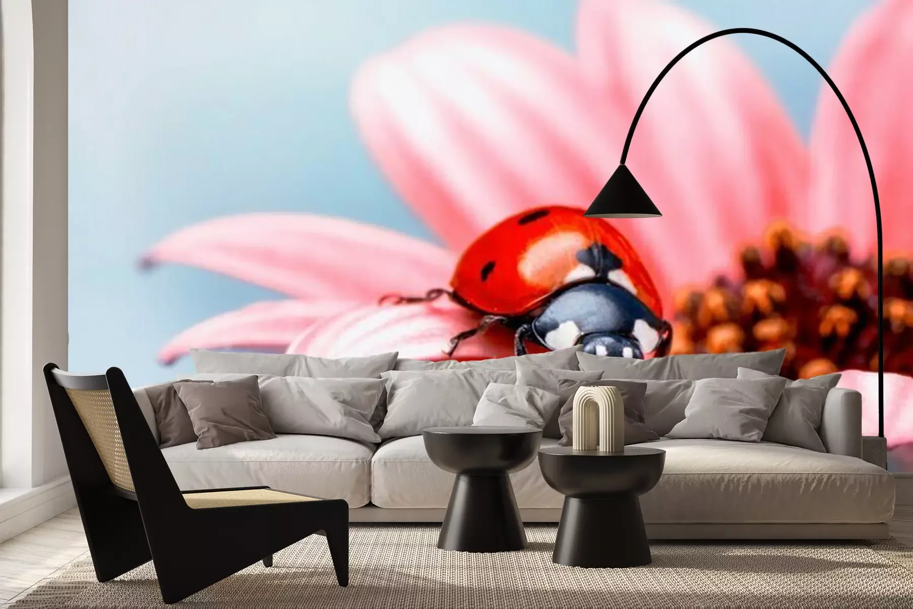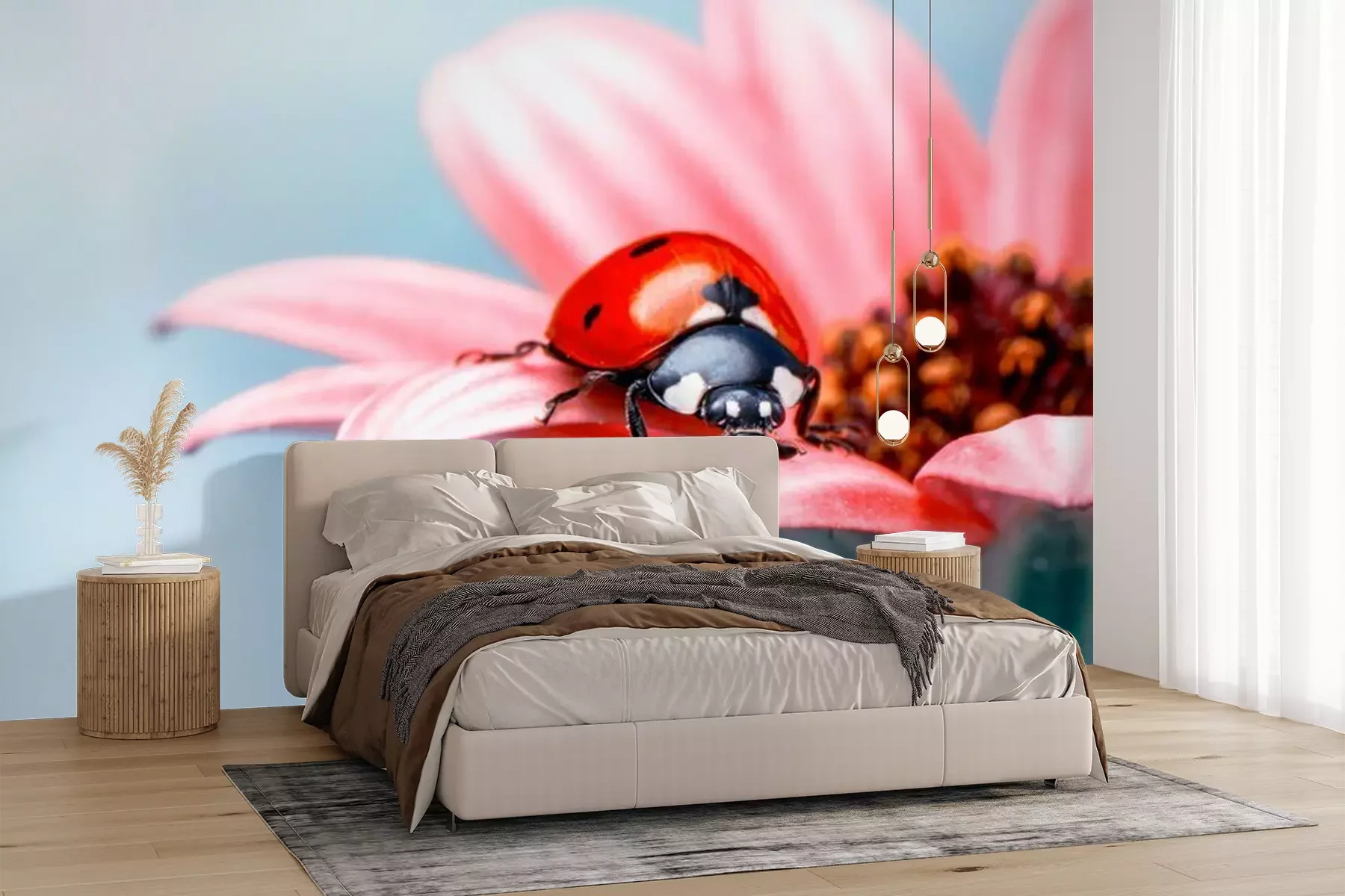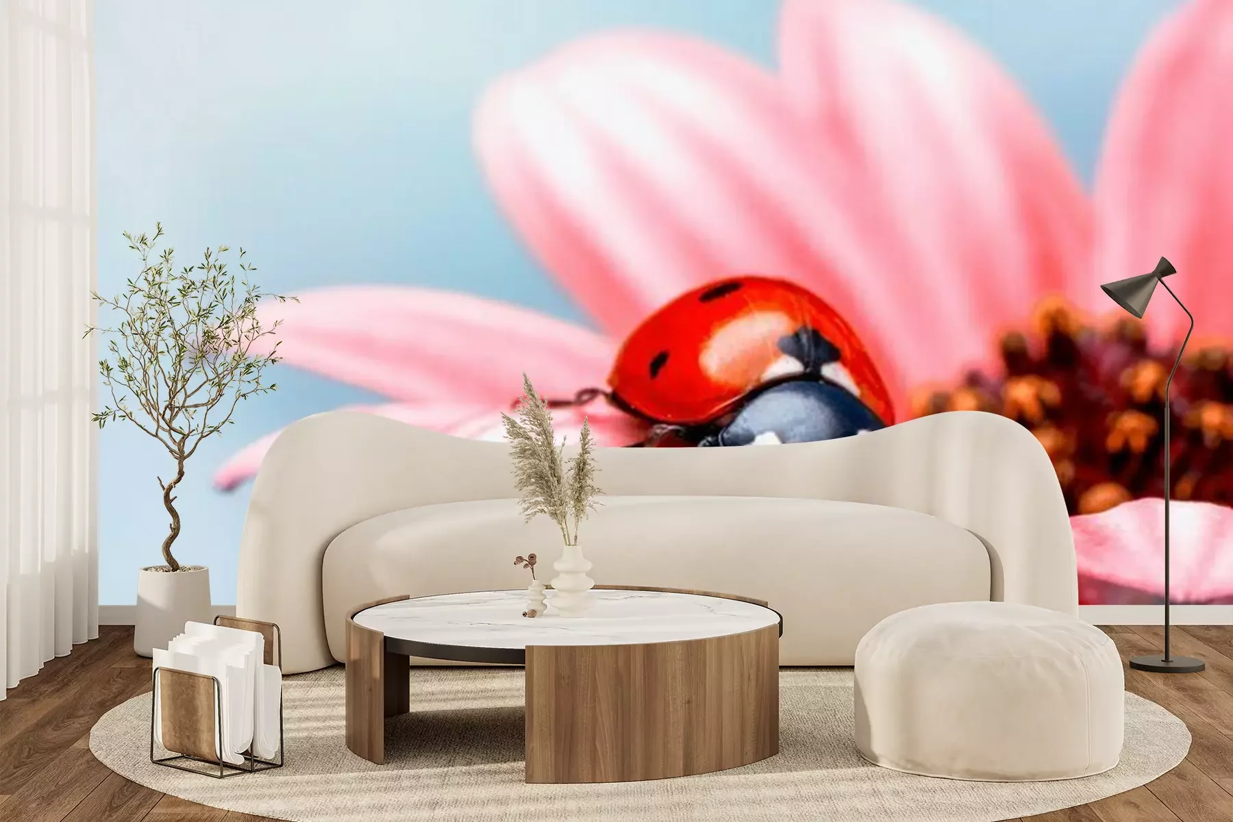Sticker Rood lieveheersbeestje op roze bloemetje