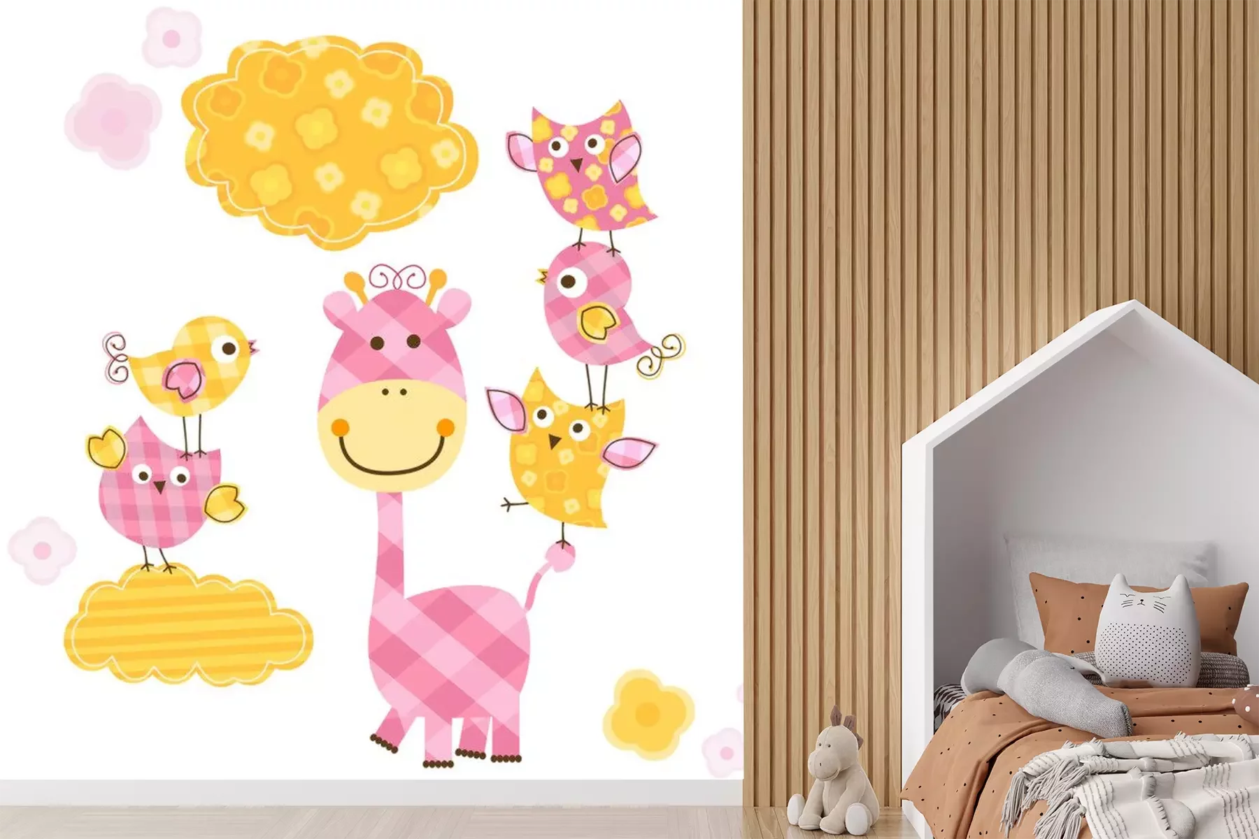 Gele geruite giraf onder vogelsProbleemloze bezorging verzorgd door vertrouwde vervoerders