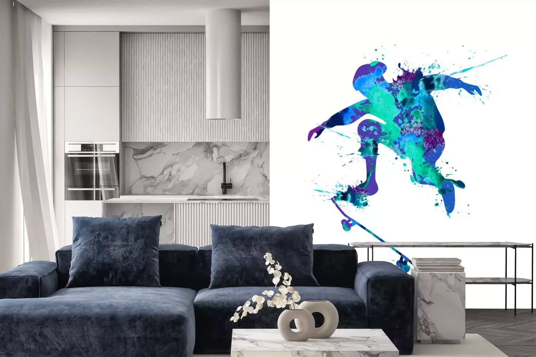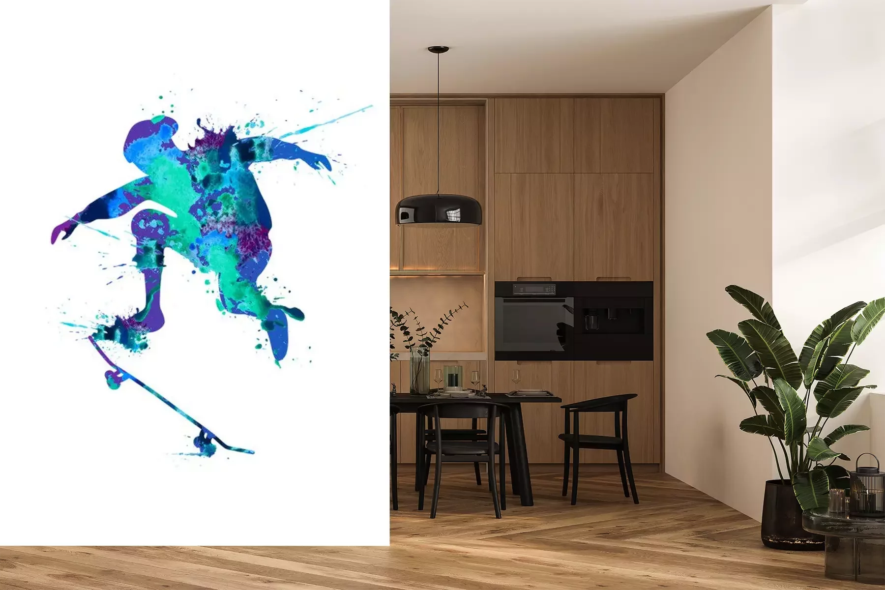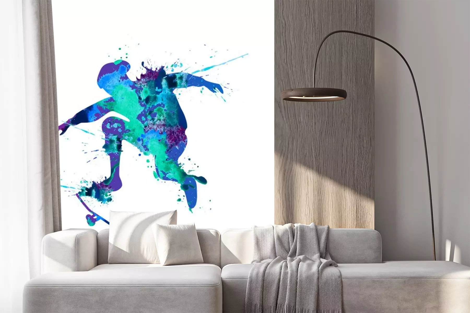 Skateboarder. Blauwe verfspattenProbleemloze bezorging verzorgd door vertrouwde vervoerders