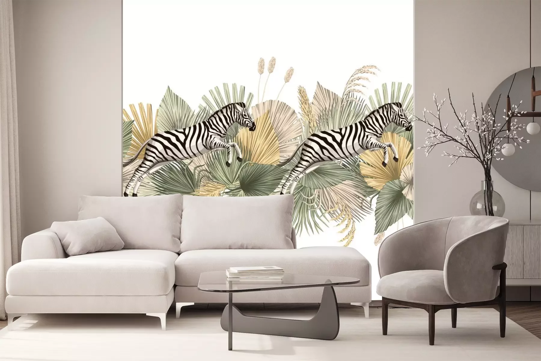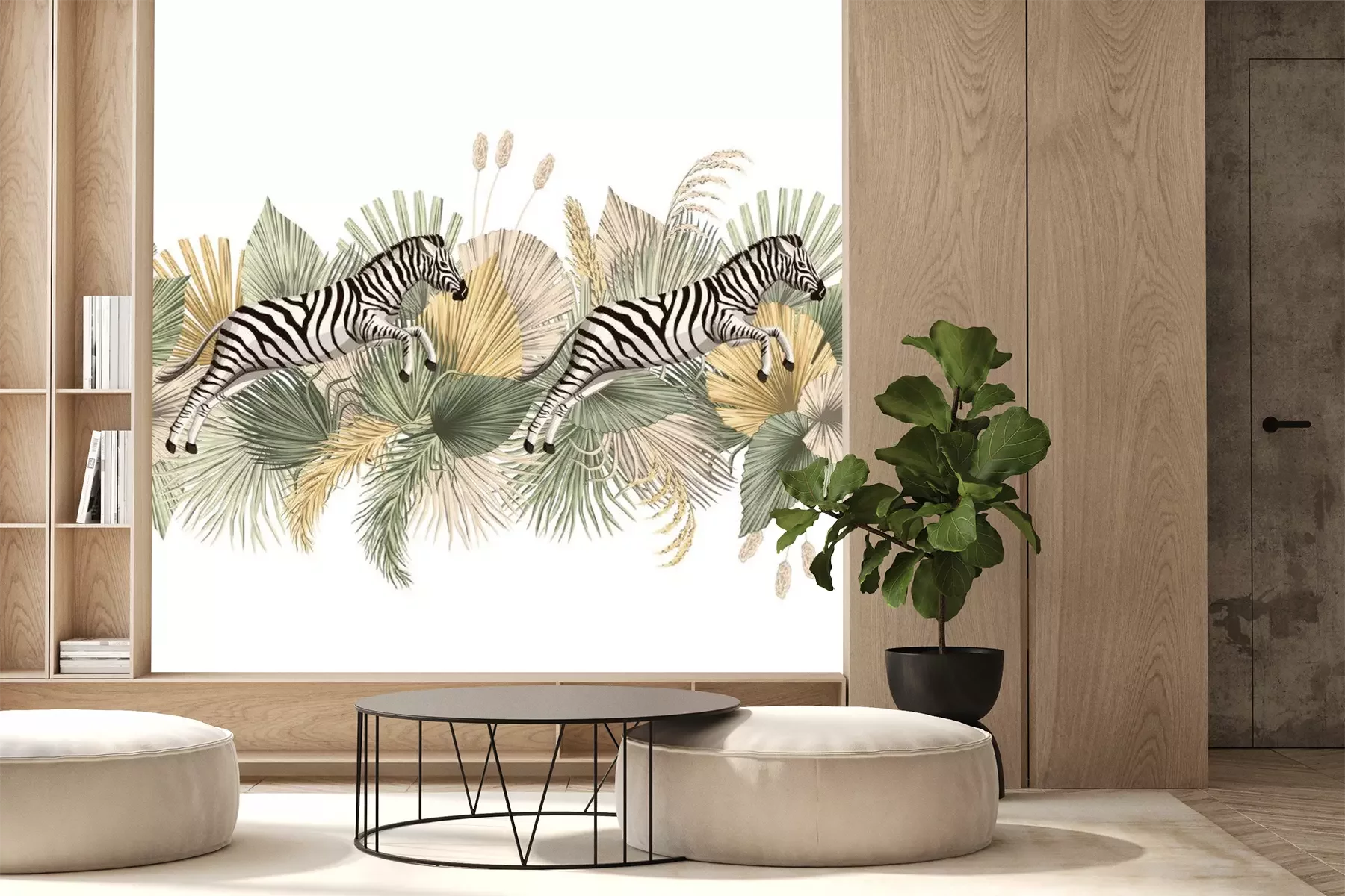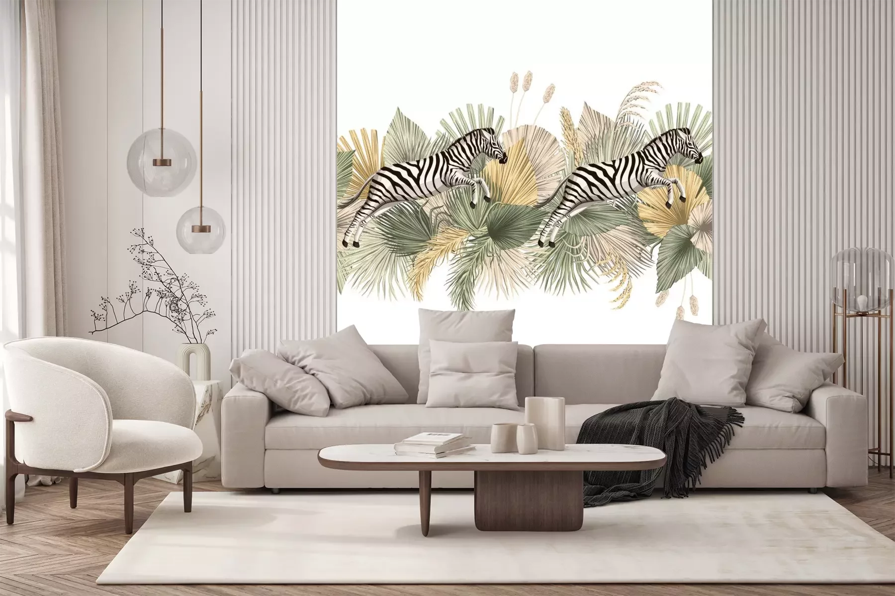 Sticker Springende zebra's tegen de achtergrond van tropische vegetatie
