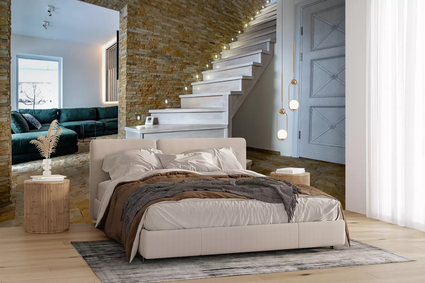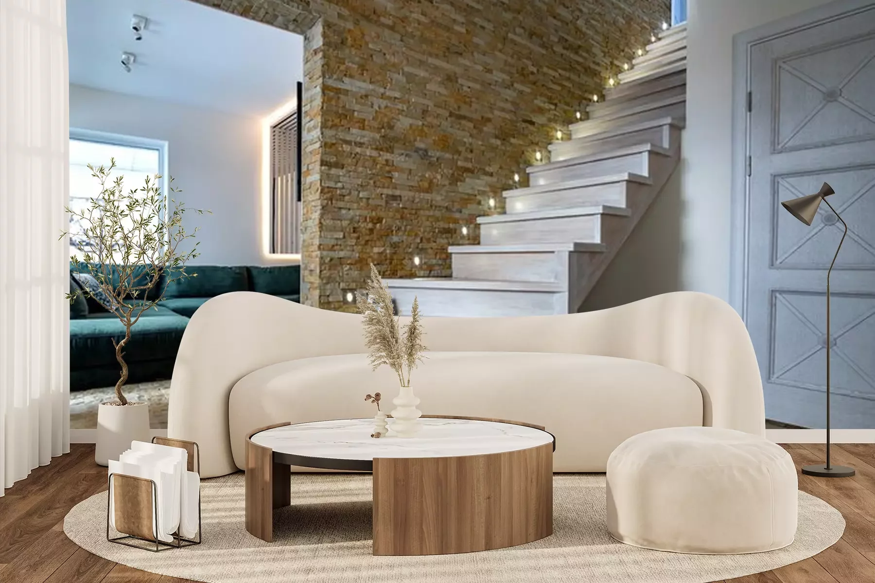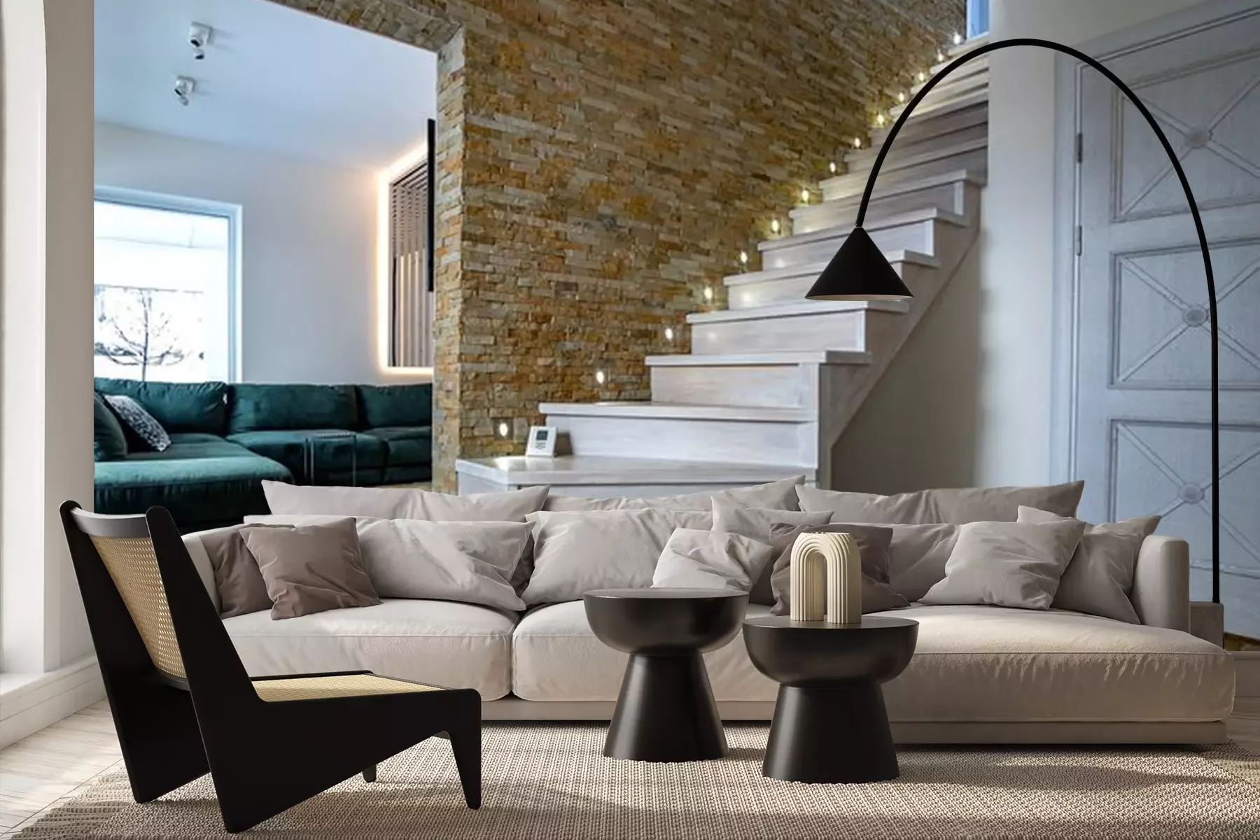 Sticker Stylish wooden contemporary staircase inside loft house interior. Modern hallway with decorative limestone brick walls and white oak stairs.