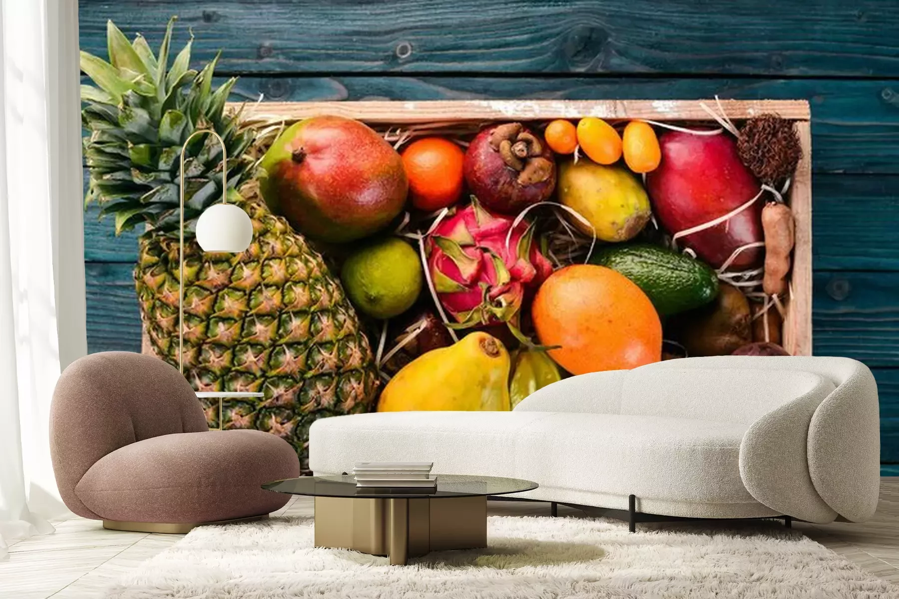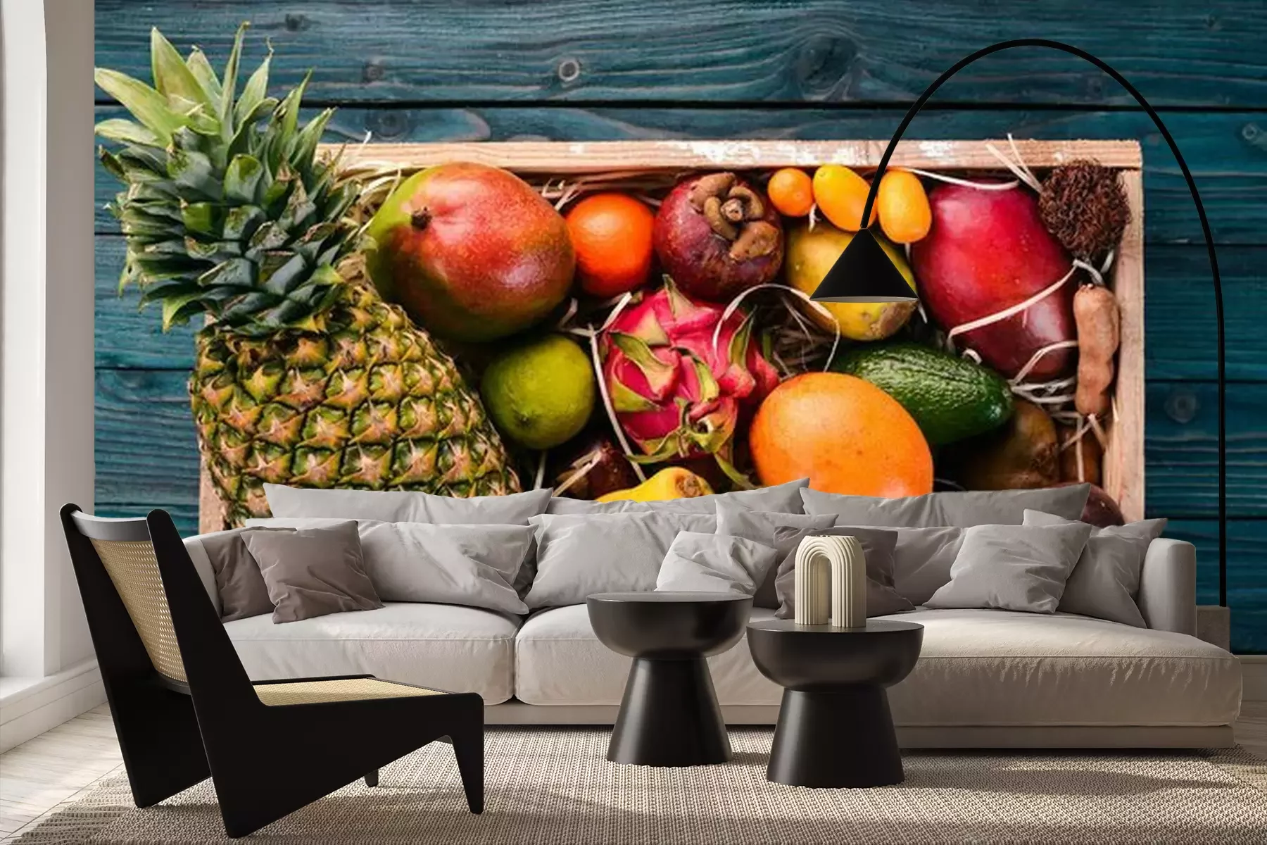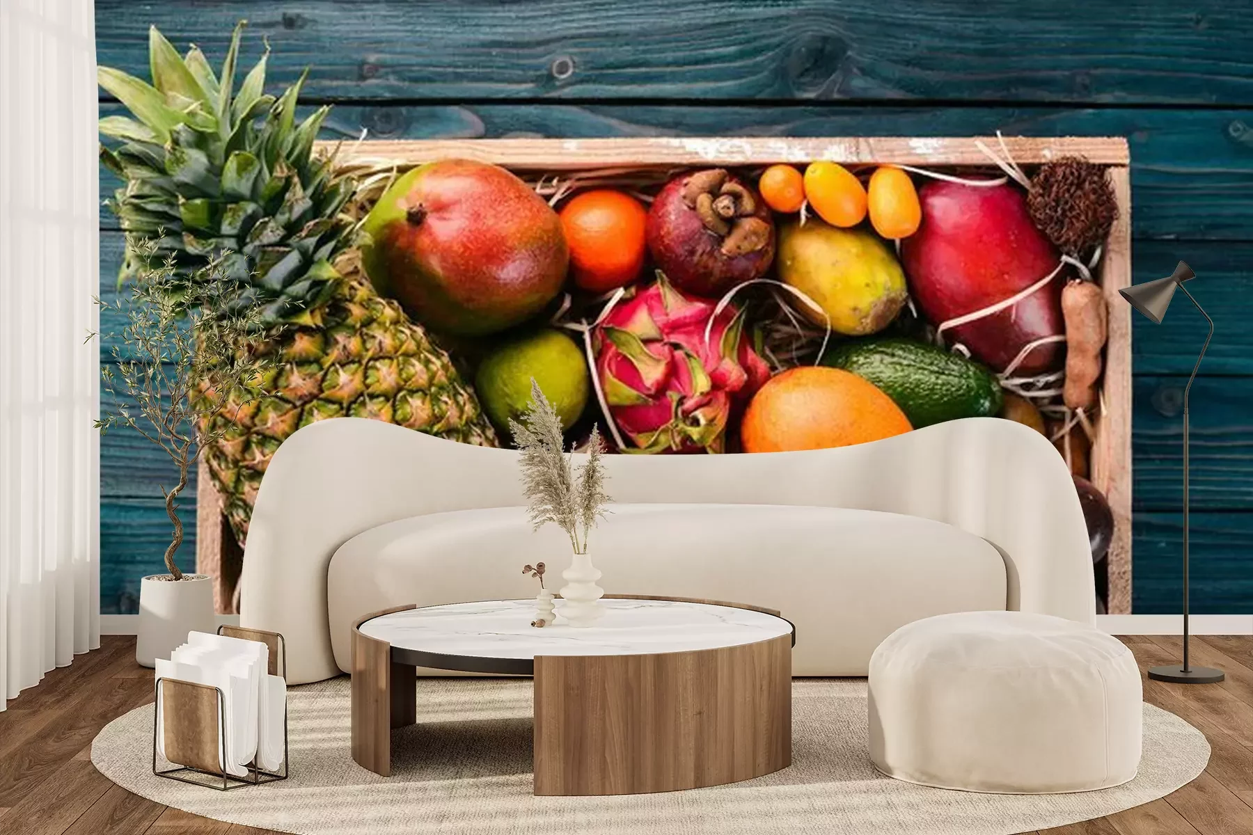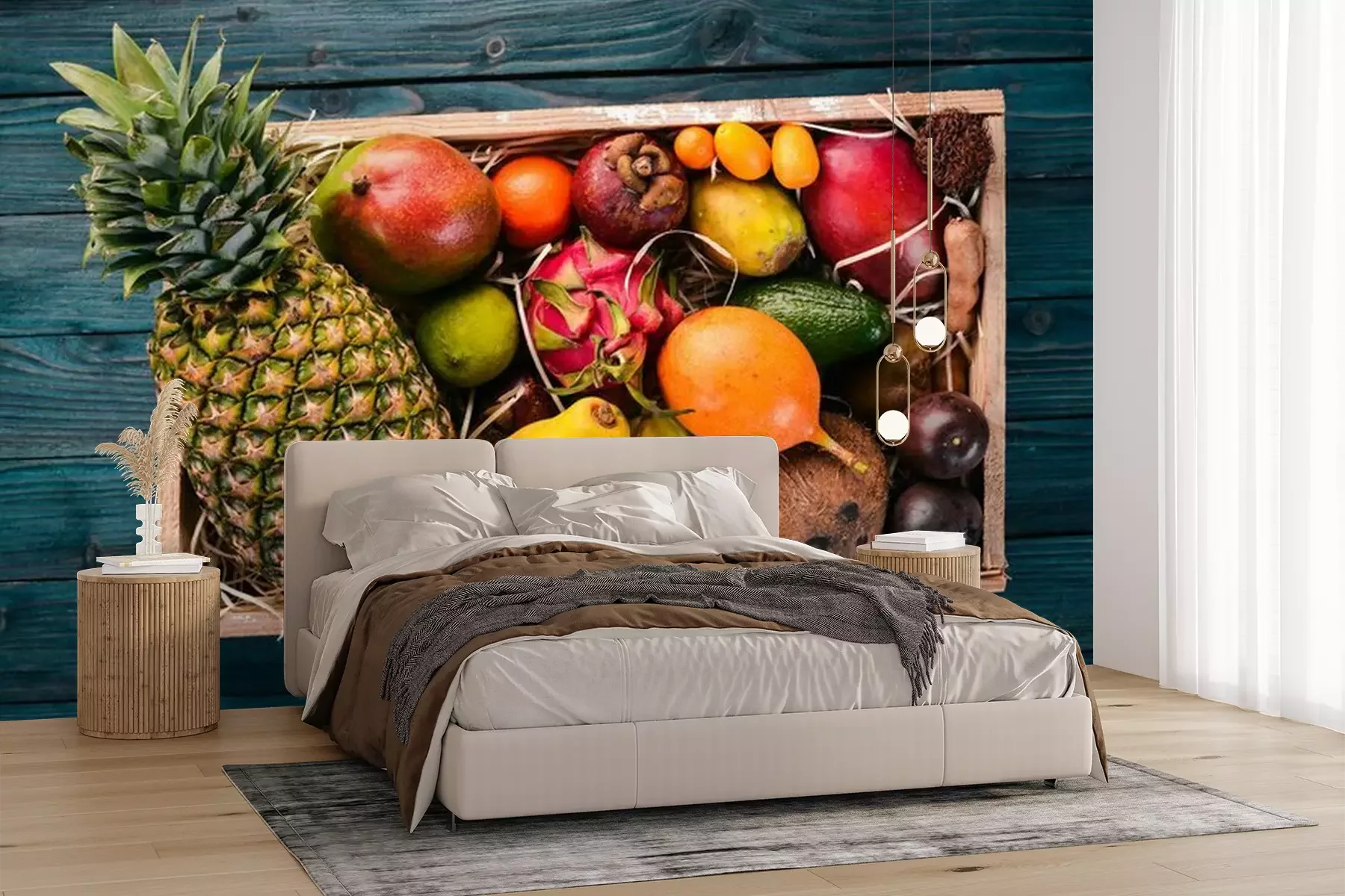 Sticker Tropisch fruit in een houten kist. Papaya, Dragon Fruit, ramboetan, tamarinde, cactussen, avocado, granadilla, carambola, kumquat, mango, mangosteen, passievrucht, kokosnoot.