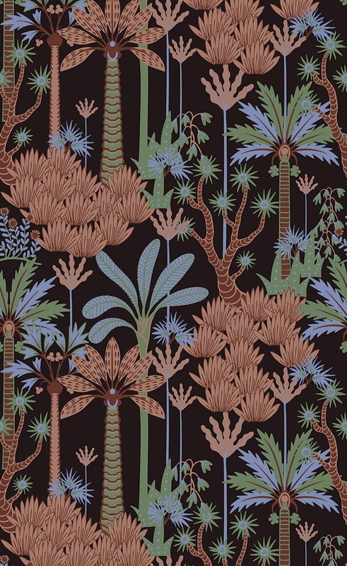 Tropische vegetatie in tinten bruin groen en blauw op donkere achtergrond