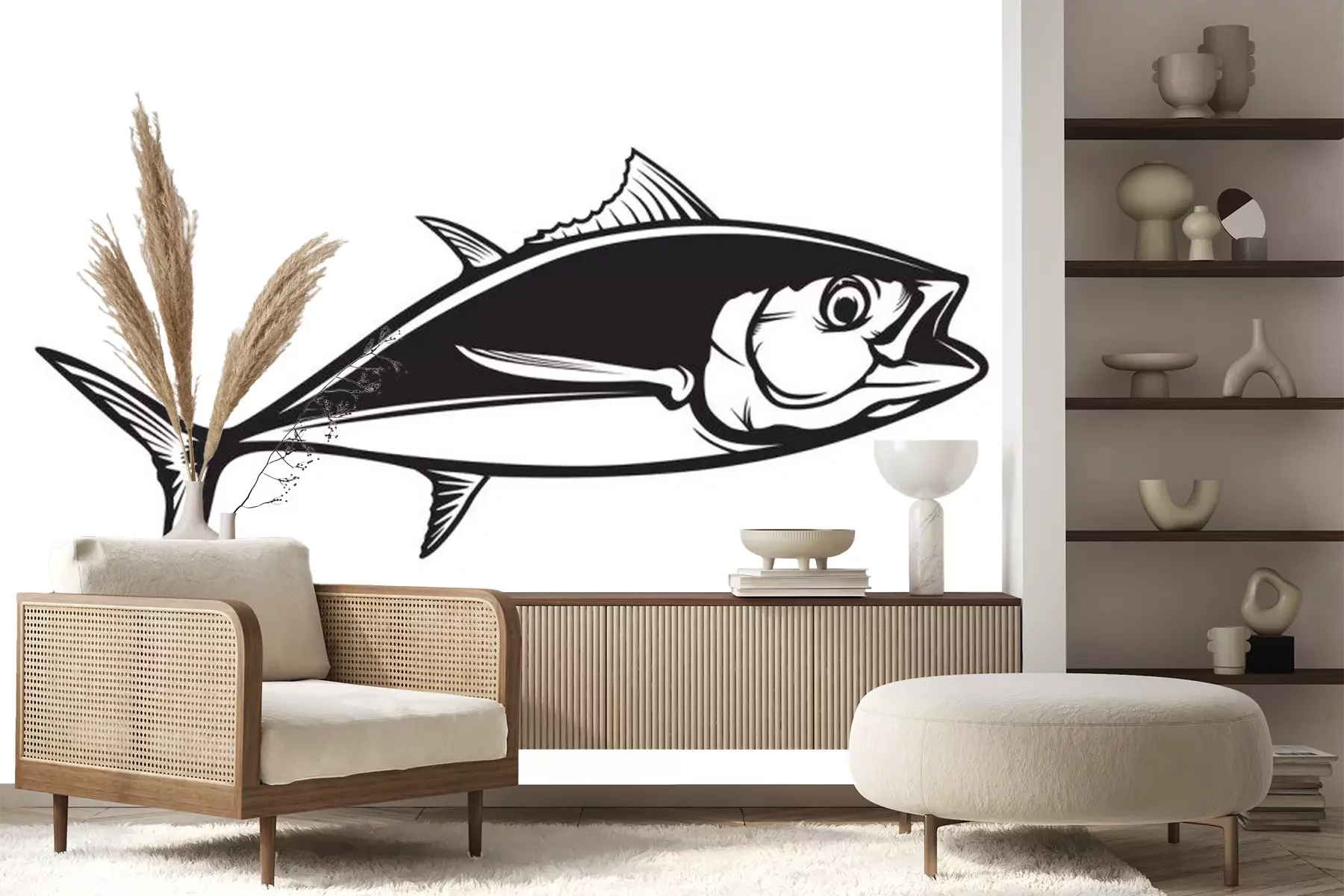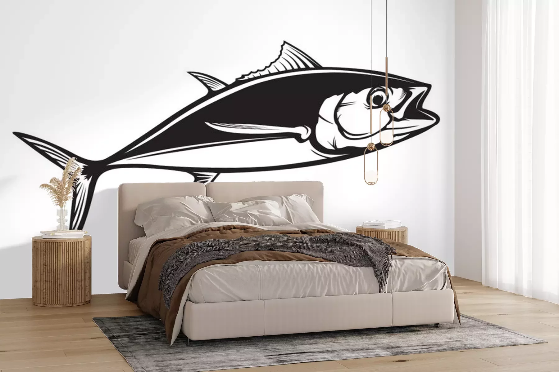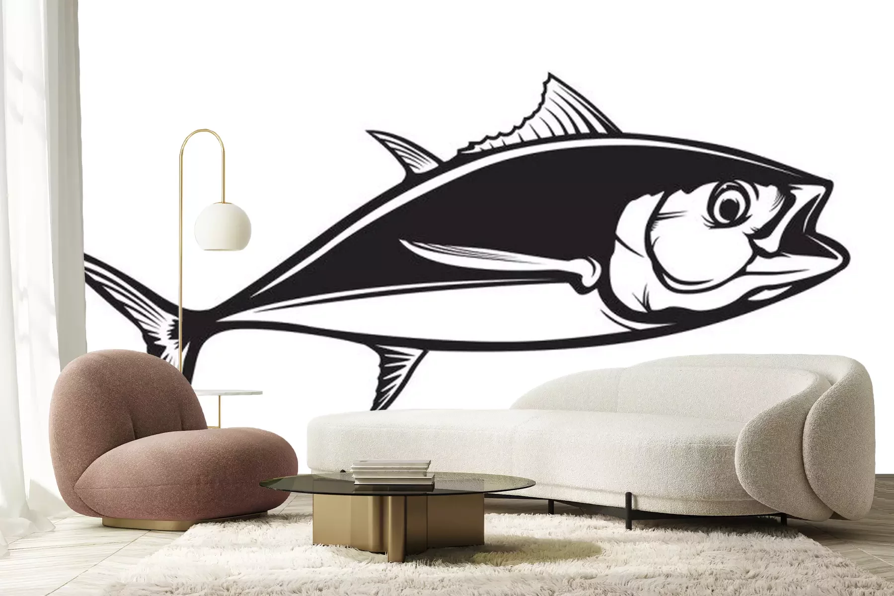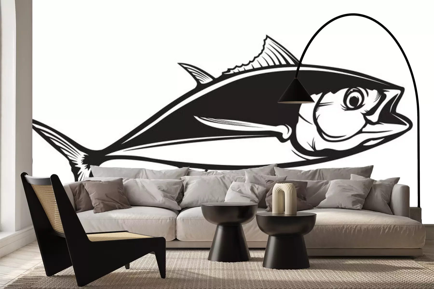 Sticker Tuna big fishing logo illustration. Tuna fish fishing vector emblem. Blue fin fish marine theme. Angry fish.