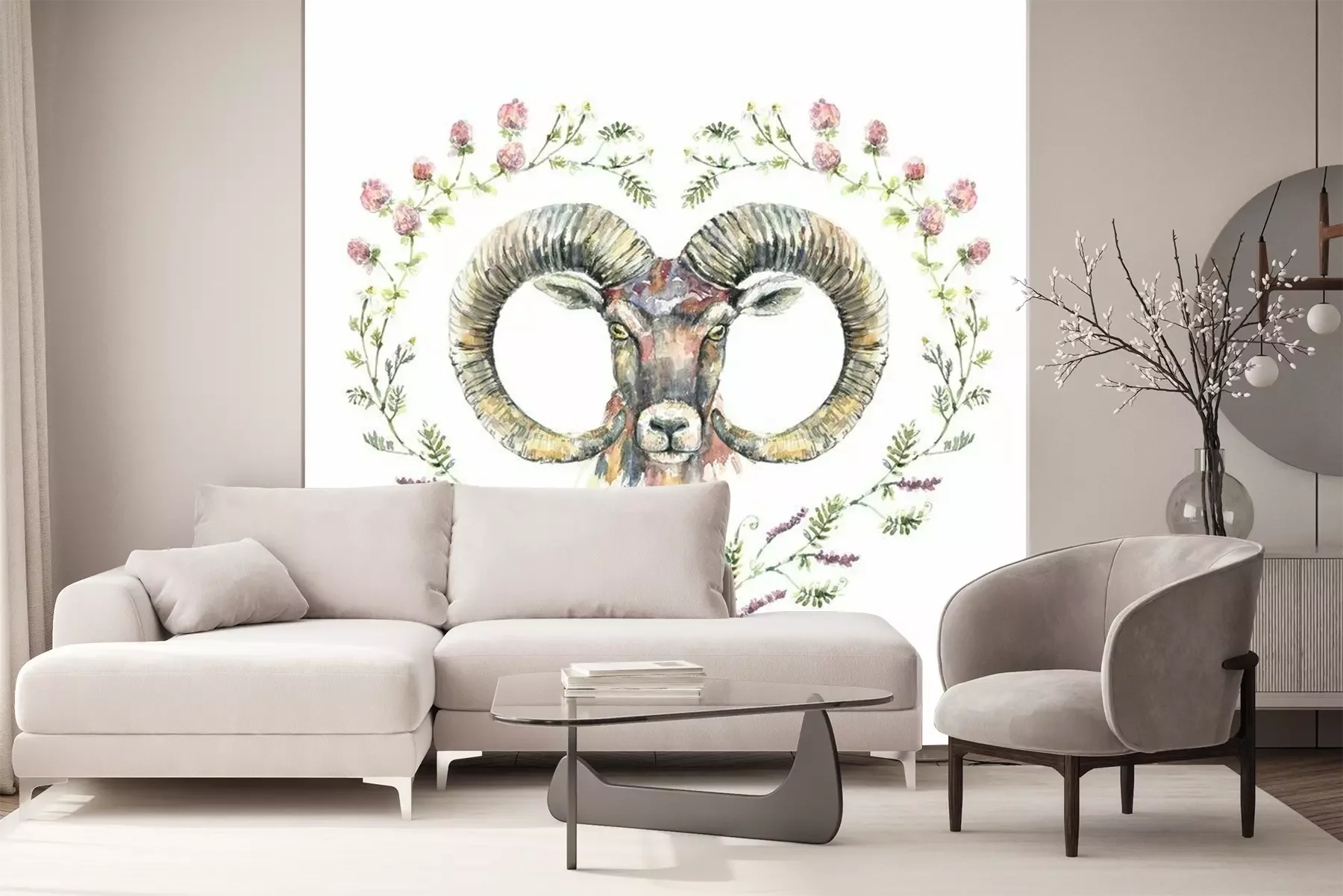 Sticker Waterverfportret van ram met een kroon van wildflowers.