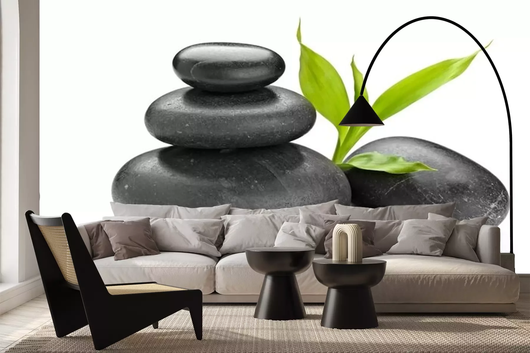 Zwarte platte stenen en bamboeFotobehang