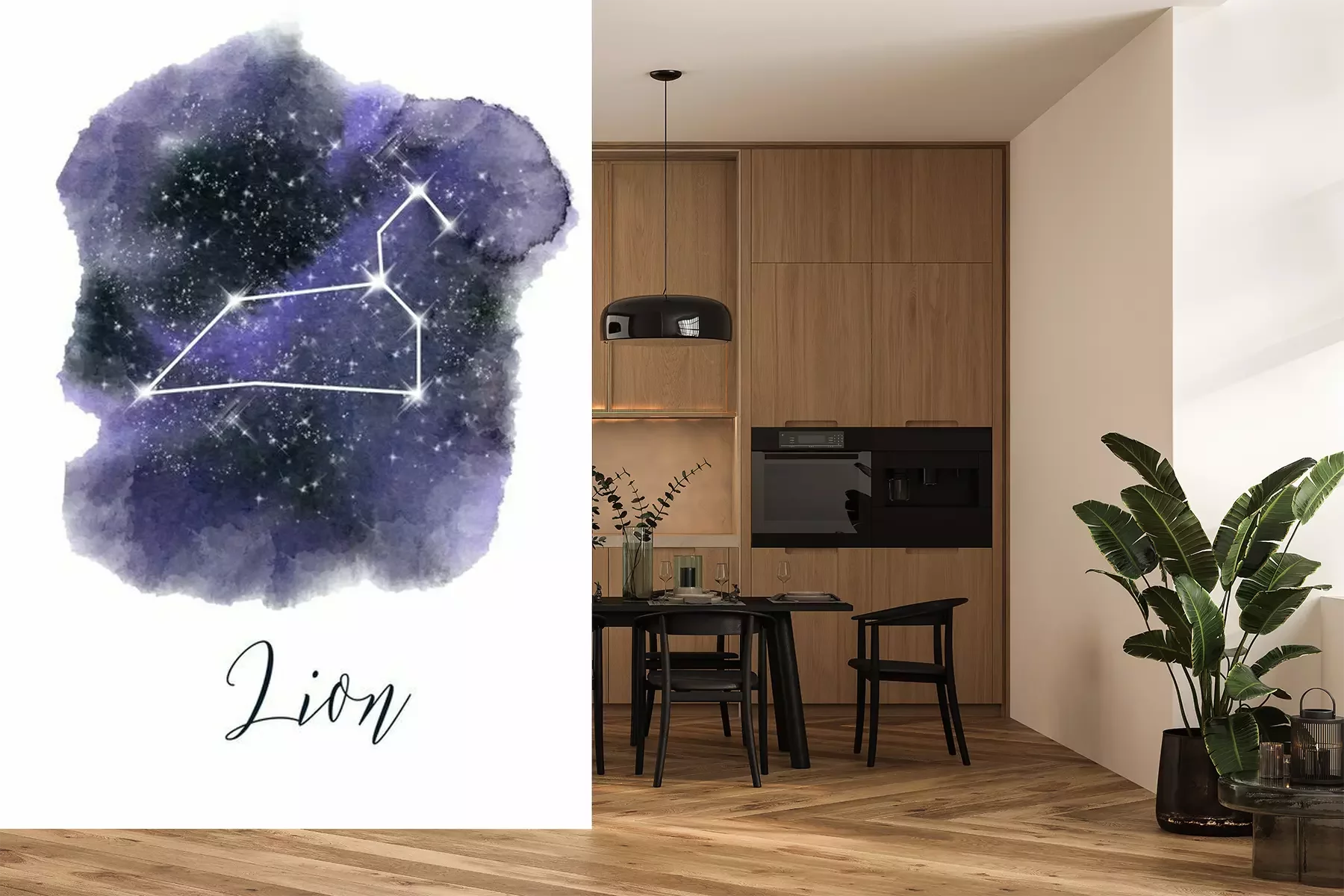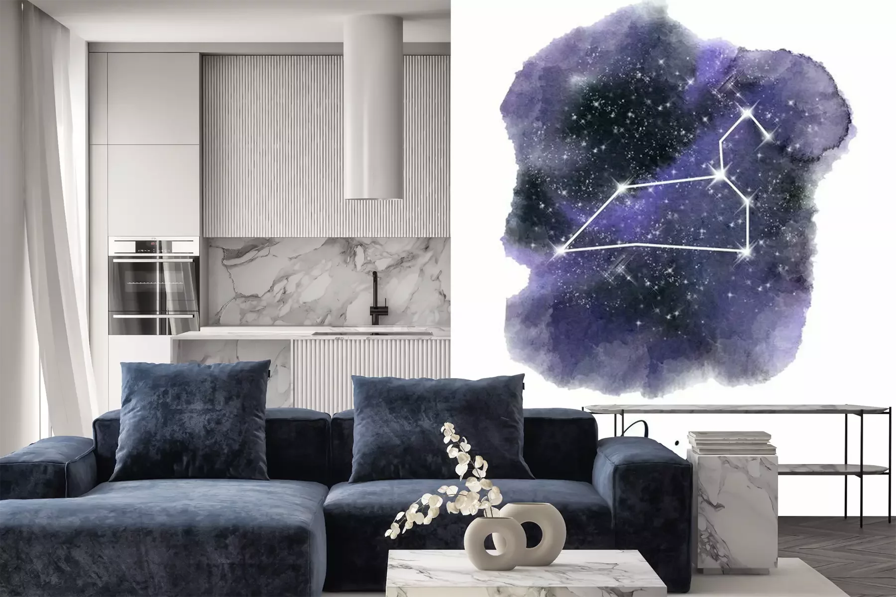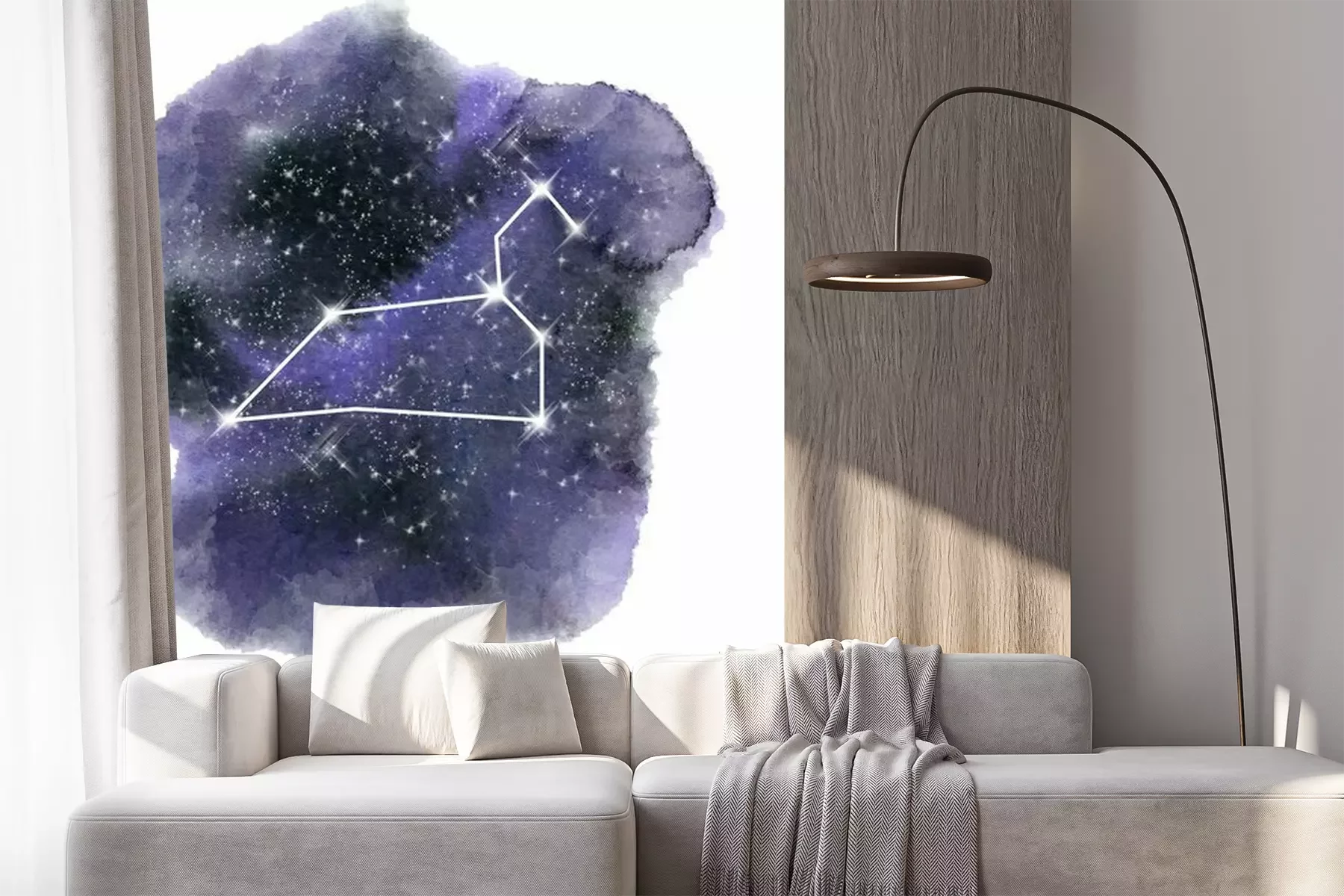 Sticker Zodiac sign Leo. Dark blue hand drawn watercolor night sky with stars. Rough, artistic edges. Raster version.