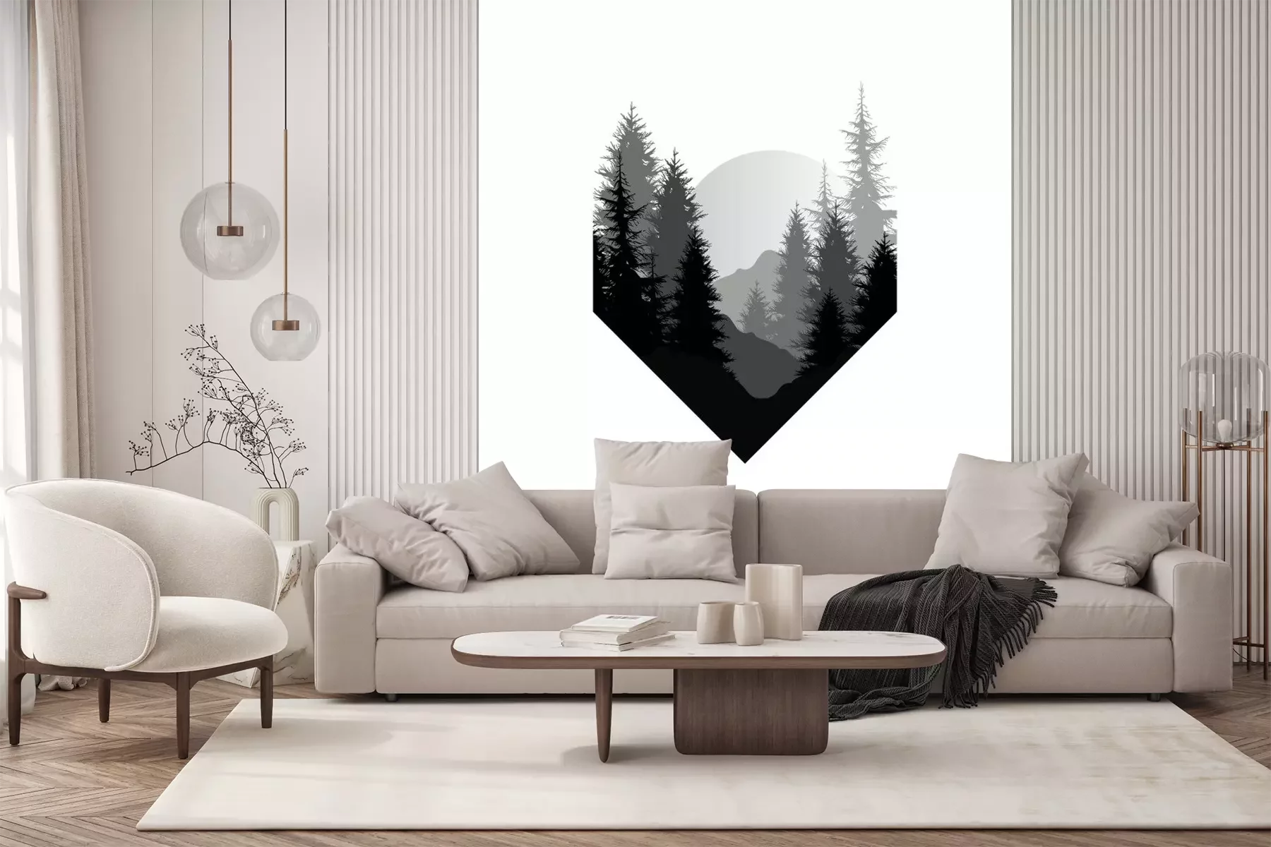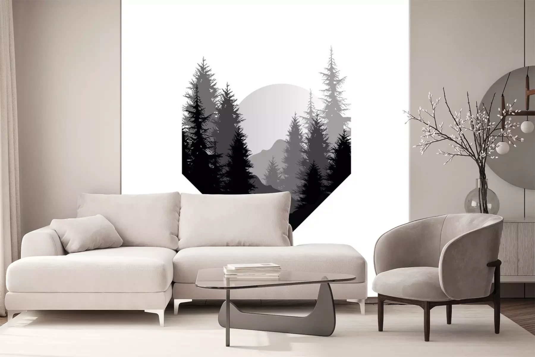 Zwart-wit bos en zon tekenenProbleemloze bezorging verzorgd door vertrouwde vervoerders