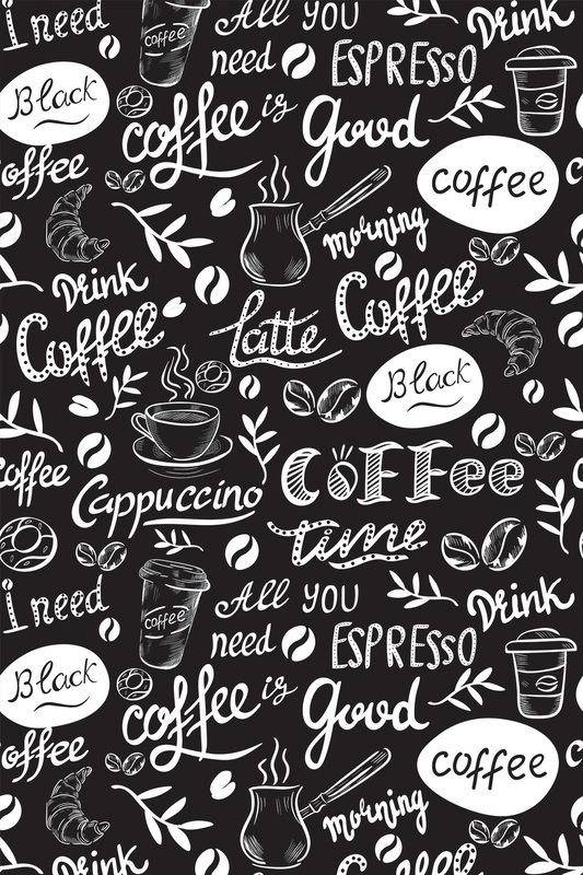 Zwart-wit patroon met koffiemotief en opschriften